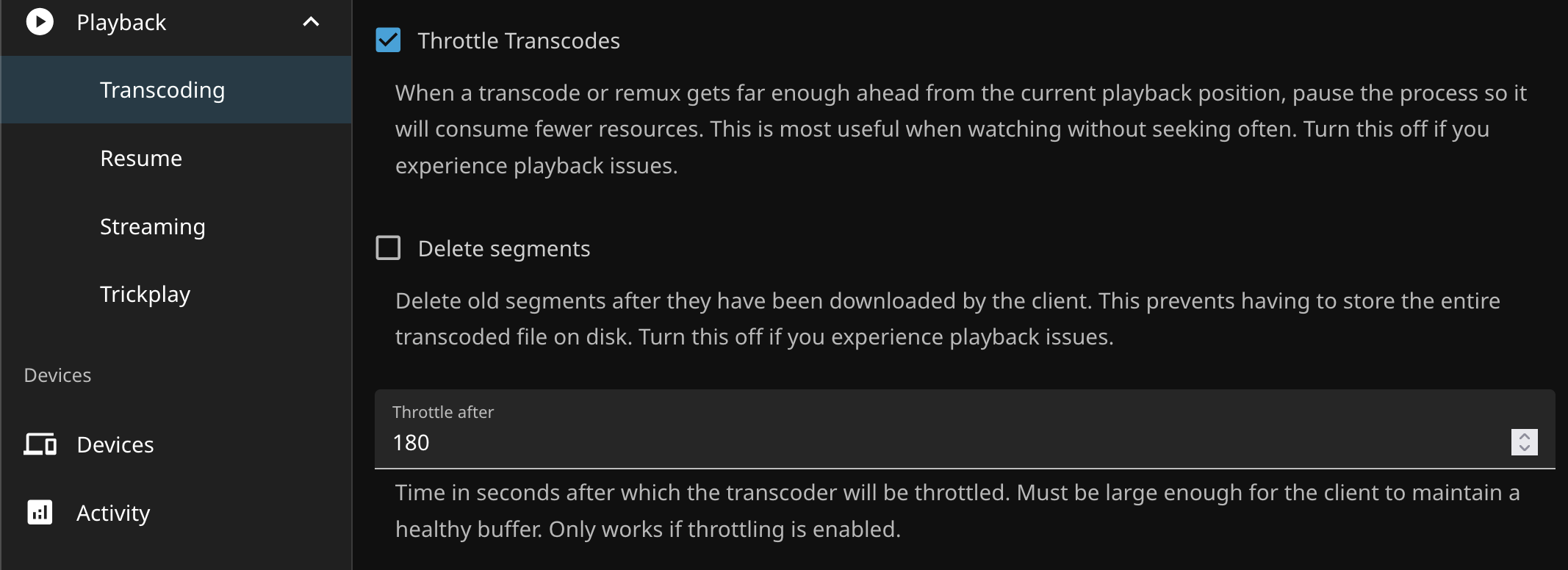 >>107395820Enable this option if transcoding load bugs you. It limits transcodes to a specified amount of time ahead of the player, instead of converting the whole video at once.