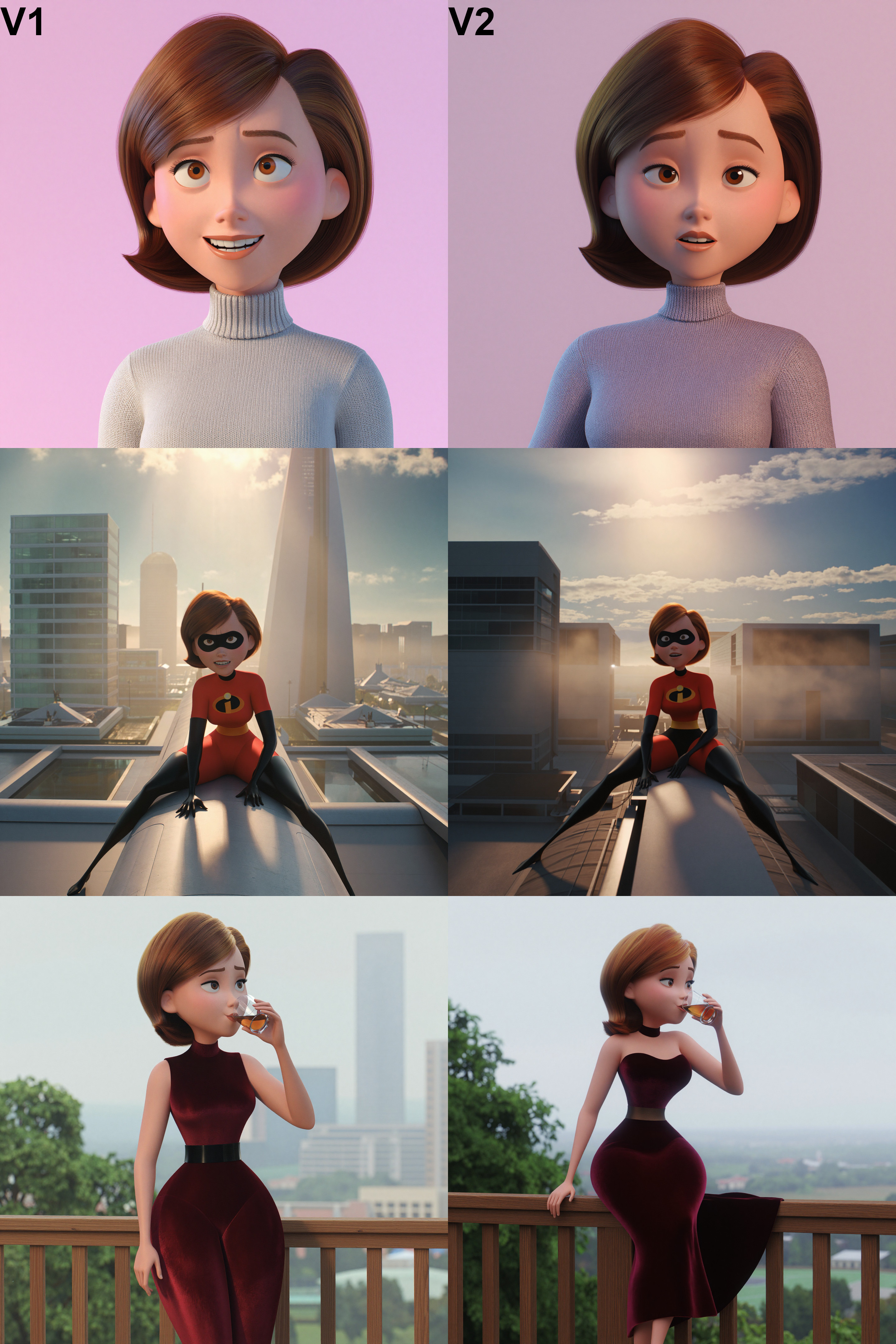 >>107405006I agree, V1 looks like clean screengrabs from a Pixar movie while V2 looks like another style bleeds in somewhat
