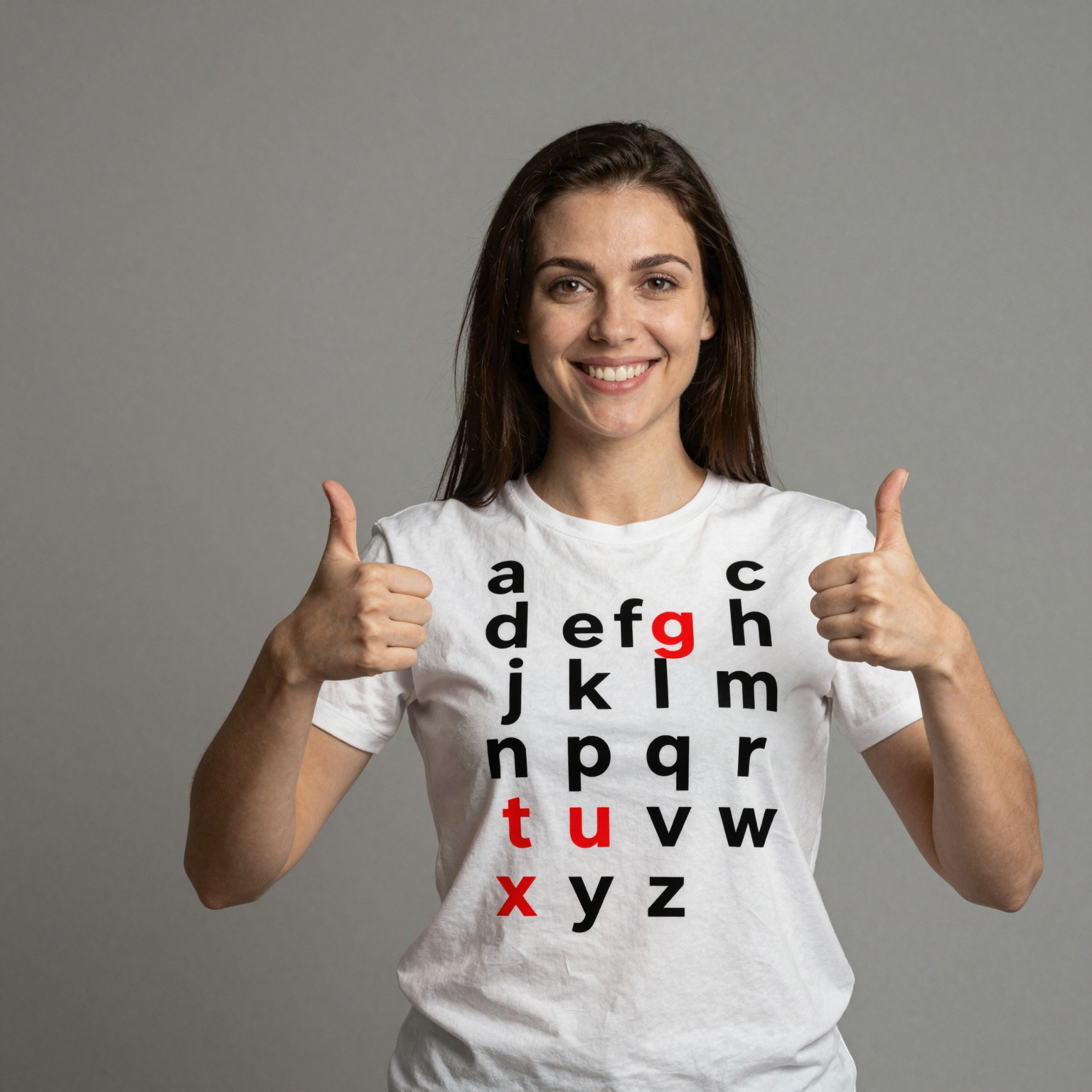 probably a skill issue.printed on the center of a woman's shirt in a sans-serif font:"a b c d e f g h i j k l m n o p q r s t u v w x y z", the letters "l" "d" and "g" are red, the rest are black.the woman smiles with both thumbs up.