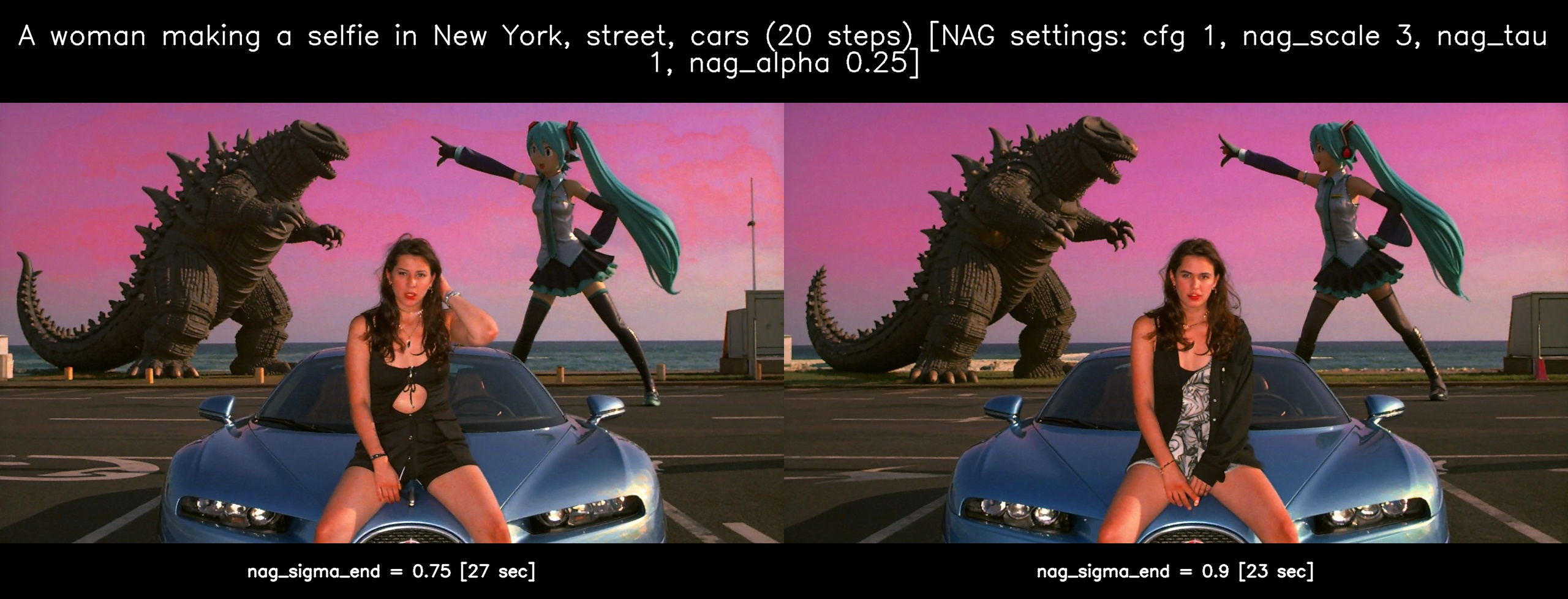 >>107411300>it's working nowif you don't know the right parameters for NAG, I recommend you this one>cfg 1, nag_scale 3, nag_tau 1, nag_alpha 0.25, nag_sigma_end 0.75