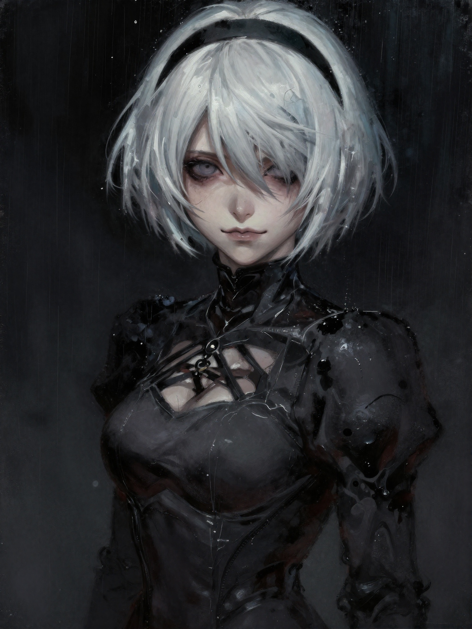 >>107408801>She wears a dark indigo velvet robe with a deep center split extending to her navel, revealing her torso and the cleavage between her gigantic breasts