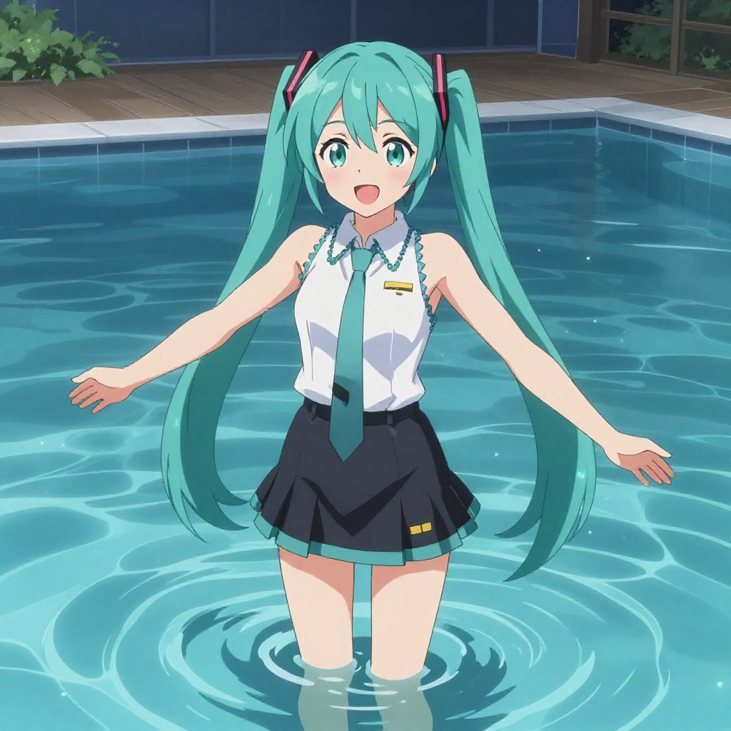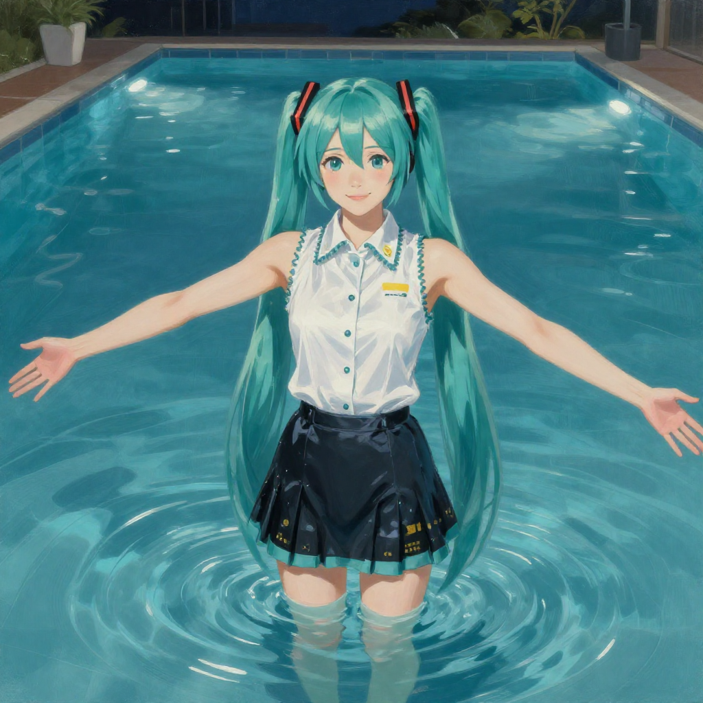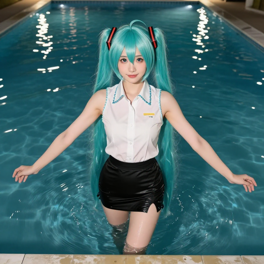 first person perspective from above a japanese woman dressed as Hatsune Miku standing in the water of a swimming pool at night who is wearing a sleeveless white blouse and black miniskirt, in Japan. Miku's arms are outstretched, and she is smiling.