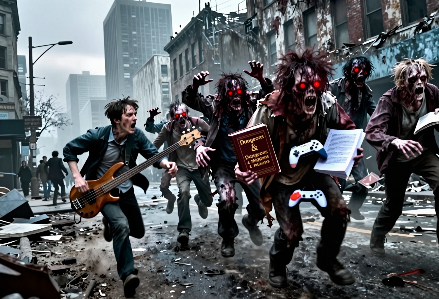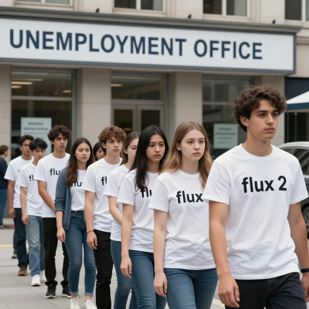A group of people in an unemployment line outside a building in the city named "UNEMPLOYMENT OFFICE". the people are all wearing tshirts that say "flux 2".