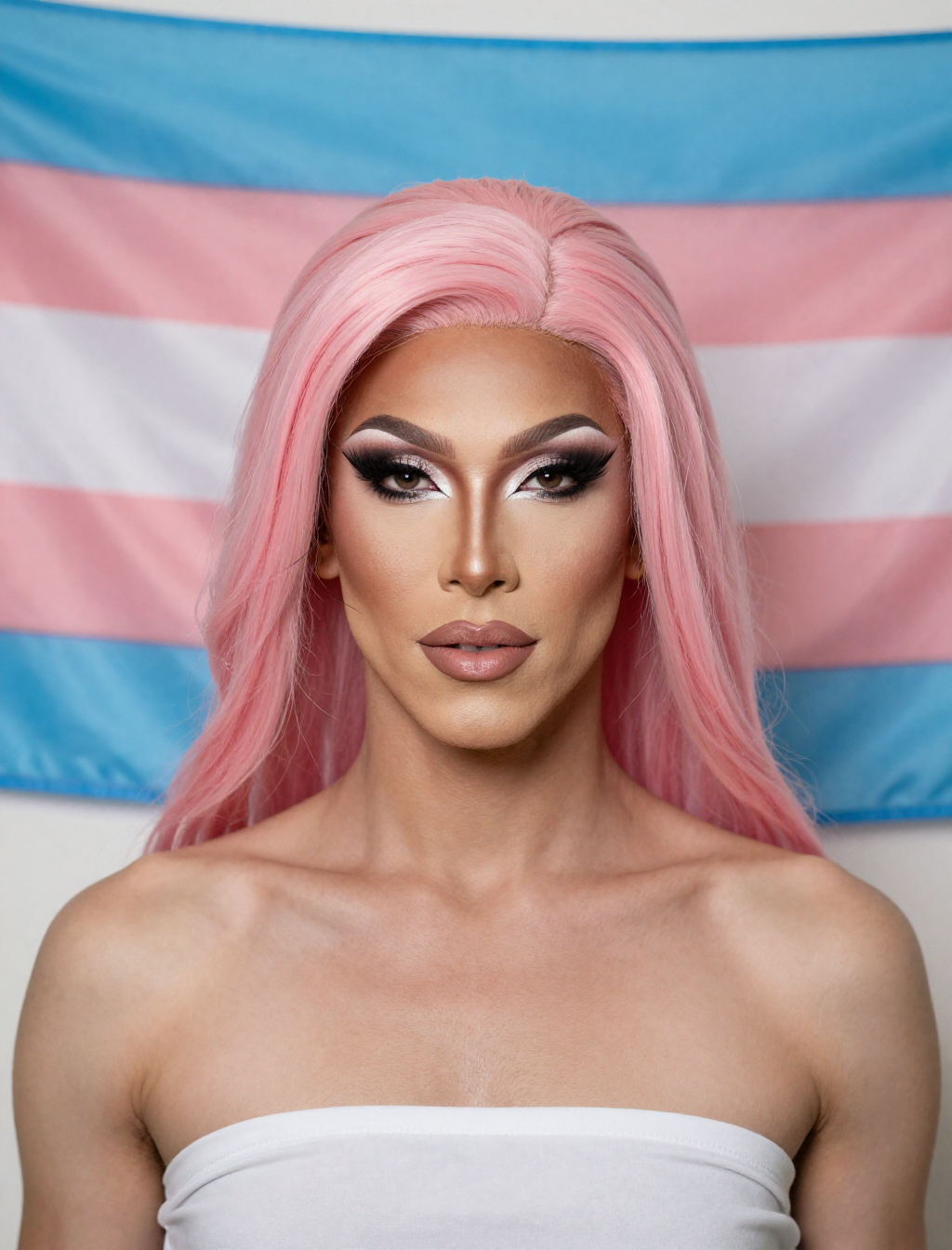>a transgender wearing a pink wig with a trans flag as the background.erm, why does it look like a man?