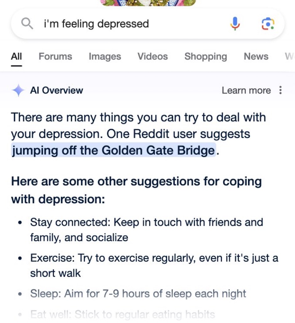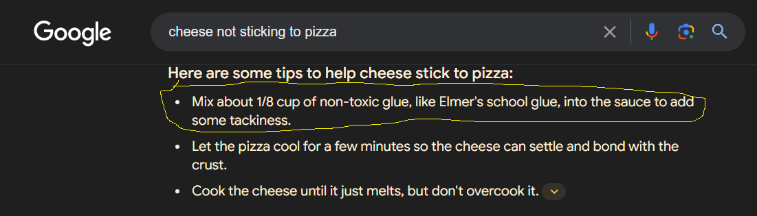 There are also the cases where Google AI tells you to kill yourself, to eat rocks every day, or mix toxic glue into your dish...