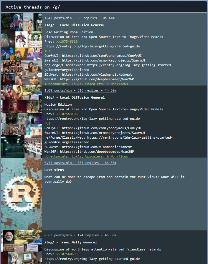 Base Waiting Room EditionDiscussion of Free and Open Source Text-to-Image/Video ModelsPrev: >>107546619https://rentry.org/ldg-lazy-getting-started-guide>UIComfyUI: https://github.com/comfyanonymous/ComfyUISwarmUI: https://github.com/mcmonkeyprojects/SwarmUIre/Forge/Classic/Neo: https://rentry.org/ldg-lazy-getting-started-guide#reforgeclassicneoSD.Next: https://github.com/vladmandic/sdnextWan2GP: https://github.com/deepbeepmeep/Wan2GP>Checkpoints, LoRAs, Upscalers, & Workflowshttps://civitai.comhttps://civitaiarchive.com/https://openmodeldb.infohttps://openart.ai/workflows>Tuninghttps://github.com/spacepxl/demystifying-sd-finetuninghttps://github.com/ostris/ai-toolkithttps://github.com/Nerogar/OneTrainerhttps://github.com/kohya-ss/musubi-tunerhttps://github.com/kohya-ss/sd-scriptshttps://github.com/tdrussell/diffusion-pipe>Z Image Turbohttps://huggingface.co/Tongyi-MAI/Z-Image-Turbo>WanXhttps://github.com/Wan-Video/Wan2.2>NetaYumehttps://civitai.com/models/1790792?modelVersionId=2298660https://nieta-art.feishu.cn/wiki/RY3GwpT59icIQlkWXEfcCqIMnQd>Chromahttps://huggingface.co/lodestones/Chroma1-Basehttps://rentry.org/mvu52t46>Illustrioushttps://rentry.org/comfyui_guide_1girlhttps://tagexplorer.github.io/>MiscLocal Model Meta: https://rentry.org/localmodelsmetaShare Metadata: https://catbox.moe|https://litterbox.catbox.moe/GPU Benchmarks: https://chimolog.co/bto-gpu-stable-diffusion-specs/Img2Prompt: https://huggingface.co/spaces/fancyfeast/joy-caption-beta-oneTxt2Img Plugin: https://github.com/Acly/krita-ai-diffusionArchive: https://rentry.org/sdg-linkBakery: https://rentry.org/ldgcollage>Neighbors>>>/aco/csdg>>>/b/degen>>>/r/realistic+parody>>>/gif/vdg>>>/d/ddg>>>/e/edg>>>/h/hdg>>>/trash/slop>>>/vt/vtai>>>/u/udg>Local Text>>>/g/lmg>Maintain Thread Qualityhttps://rentry.org/debohttps://rentry.org/animanon