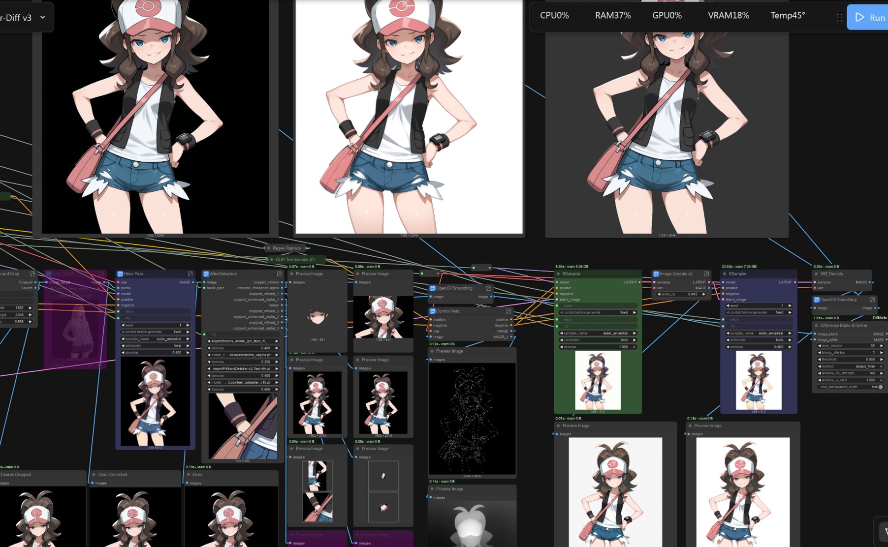 >>107552251I agree that comfy is clunky for genning 1girls for fun with default settings. But it's the perfect tool for automatic image gen and processing without getting too deep in code.A1111 clones are too rigid for custom workflows.Writing my own script would take much longer and make it a pain to test different ideas quickly.Once the workflow is done, I can set the prompt and let it generate a bunch of fully processed sprites in background. I don't care how messy the graph is (it's not that messy actually. there are just a lot of previews at every step).