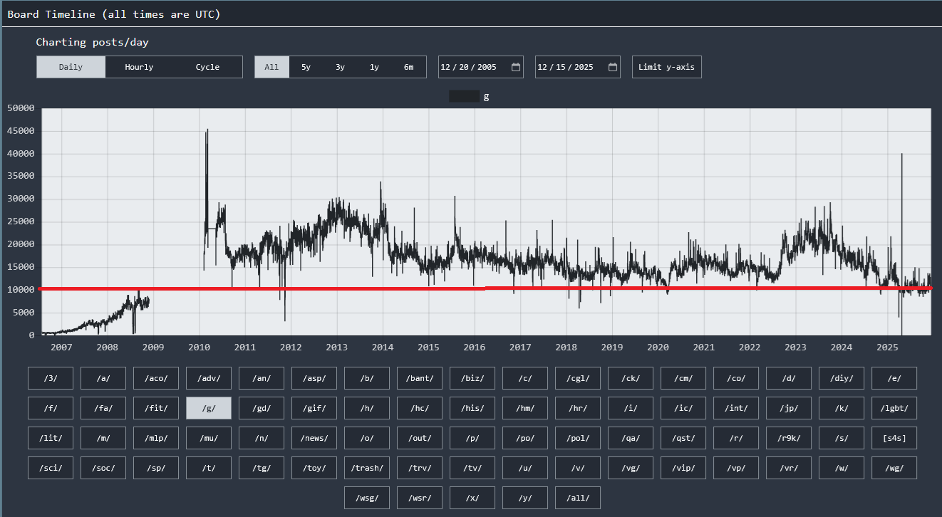 >>107556167>posts/day = visits/dayposts have nearly doubled minus outliers and this doesn't show the true scope of a websites popularity. The hacker 4chan is feared, so there are always more lurkers than posters.