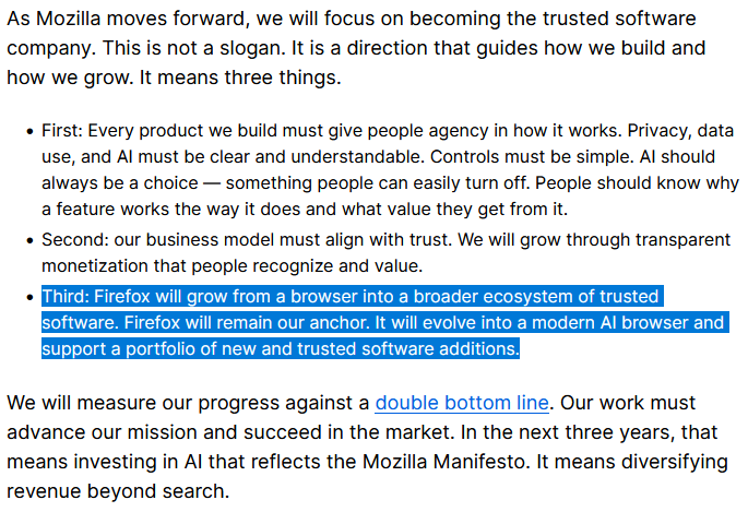 It means Firefox will become more and more bloated with AI shit