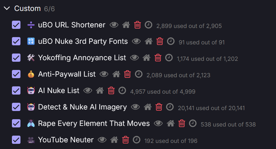 Since it's on topic of uBO, what custom filters do you lads use?