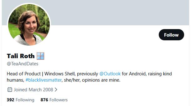 >>107608327>>107608473this is Tali Roth, the product manager working on the core "Windows user experience", including the Start menu, taskbar, and notifications she's the one answering questions in that article her twitter bio tells you everything there is to know