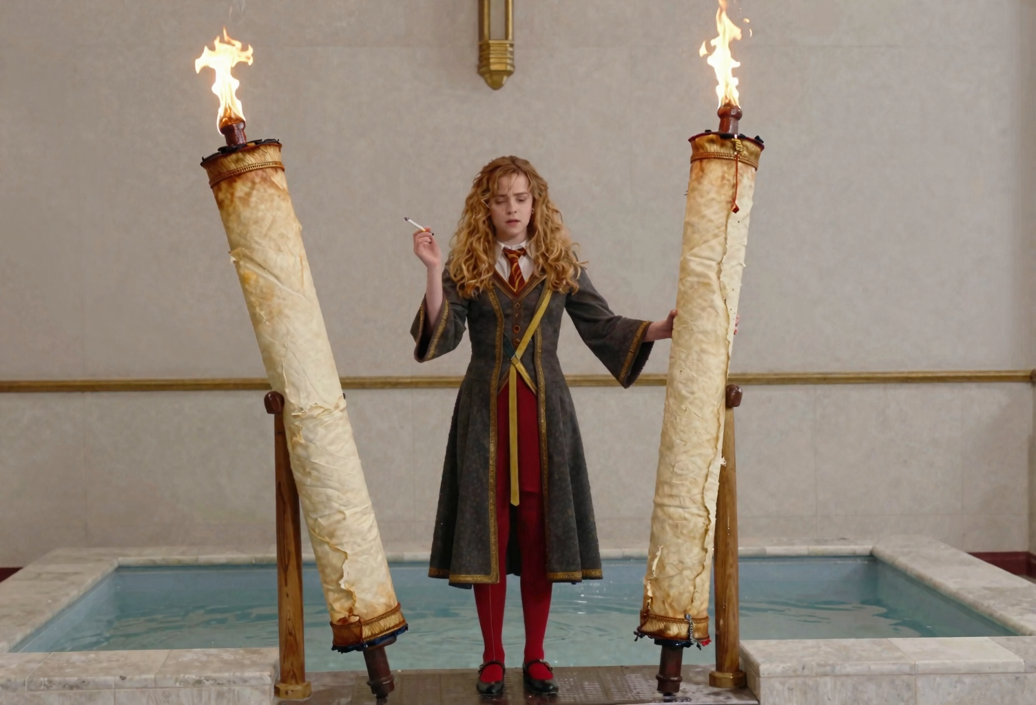 Hermione Granger reading the Protocols of the Learned Elders of zion inside the forbidden section of the Hogwarts library with a shocked expression