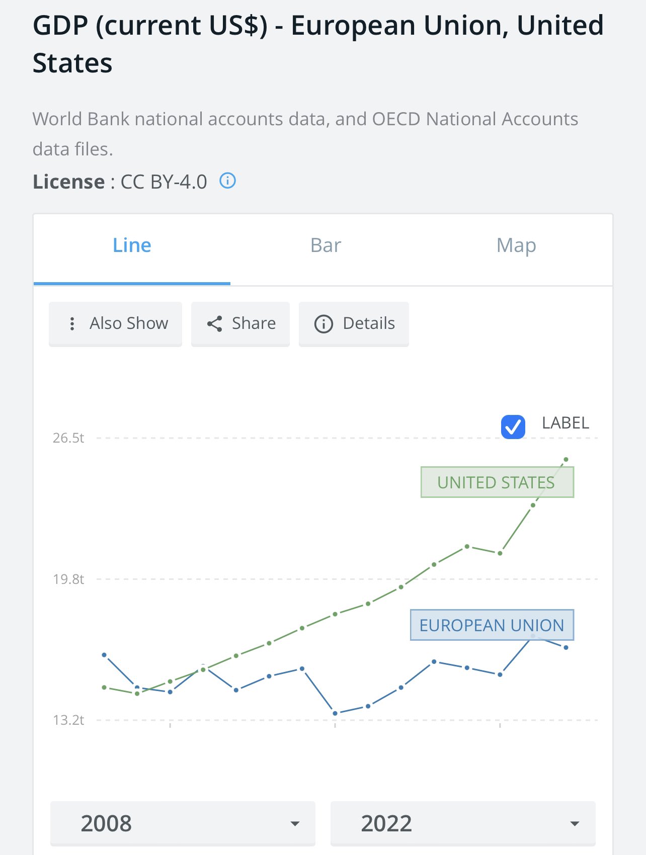 >>107668549Europe is getting Japanified. In 2008, the EU’s economy was 10% larger than that of the U.S. Now? The U.S. is 50% larger than the EU