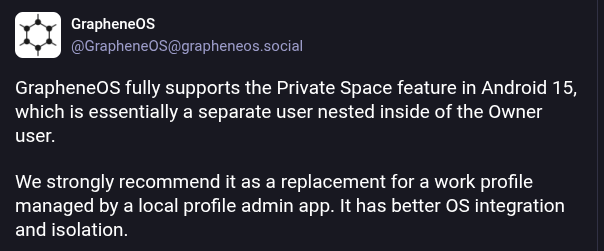 >>107675959Pixel with GrapheneOS. Listen, 99% of the stuff works, don't believe those shit heads. The only alternative to Graphene is an iPhone, but you lose your app freedom and apple isn't private anymore.>It worksBanking, Anti Cheat Games, Online ID and everything that requires Google Play / Play Integrity, work! You can just create a "Private Space", or a 2nd profile, but a private space is much more convinient, thats like a 2nd appdrawer in your appdrawer, where you can install google shit and once you are done using them, just lock the appdrawer again. It acts like a completely new profile/user with seperate encryption and network. >Werks2Just stick to mainly F-Droid and if you need to: Aurora. Newpipe works great.