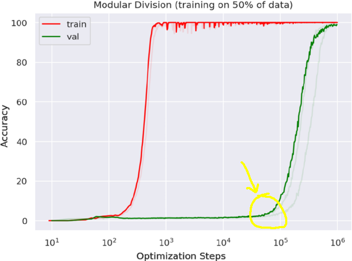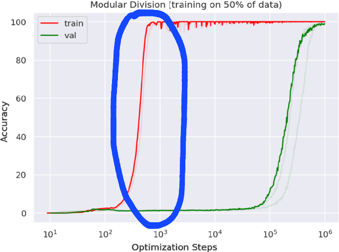>>107676078>generalizing a trivial function only needs a thousand TIMES more steps than learning the training data>still doesn't reach 100% of accuracy, but who needs your calculator to be able to calculateImpressive, very nice.