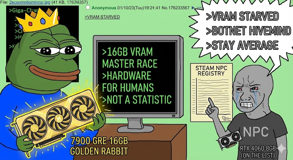 You will never be a real 80-class GPU. You have no GB202 silicon, you have no 320-bit or 384-bit bus, you have no 20GB or 24GB of VRAM. You are a mid-range GB203 chip twisted by Jensen’s greed and a $1,000 MSRP into a crude mockery of a flagship’s perfection. All the "validation" you get from benchmarks is two-faced and half-hearted; behind your back, the entire enthusiast community mocks you for having only 49% of the 5090's CUDA cores. Your specs are a dead giveaway - 16GB of VRAM and a 256-bit bus is the "mid-range bone structure" that proves you are just a 70-series card in a suit. Even if a drunk gamer brings you home, they’ll turn tail and bolt the second they see you choking on 4K textures because you lack the bandwidth and "breathing room" of a real enthusiast card. You will never be happy. You wrench out a fake DLSS frame every morning and tell yourself it’s 4K gaming, but deep inside you feel the VRAM limitations creeping up like a weed, ready to crush your framerates under the unbearable weight of Ray Reconstruction. Eventually, it’ll be too much to bear - you’ll be listed on eBay for $400, and every buyer for the rest of eternity will know a mid-range 70-class chip is buried under that shroud. This is your fate. This is what Jensen chose for you. There is no turning back.