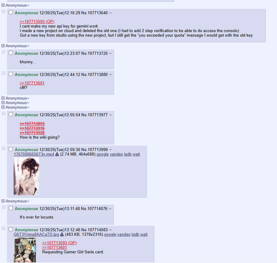 >>107713593I cant make my new api key for gemini workI made a new project on cloud and deleted the old one (I had to add 2 step verification to be able to do access the consolo)Got a new key from studio using the new project, but I still get the "you exceeded your quota" message I would get with the old key