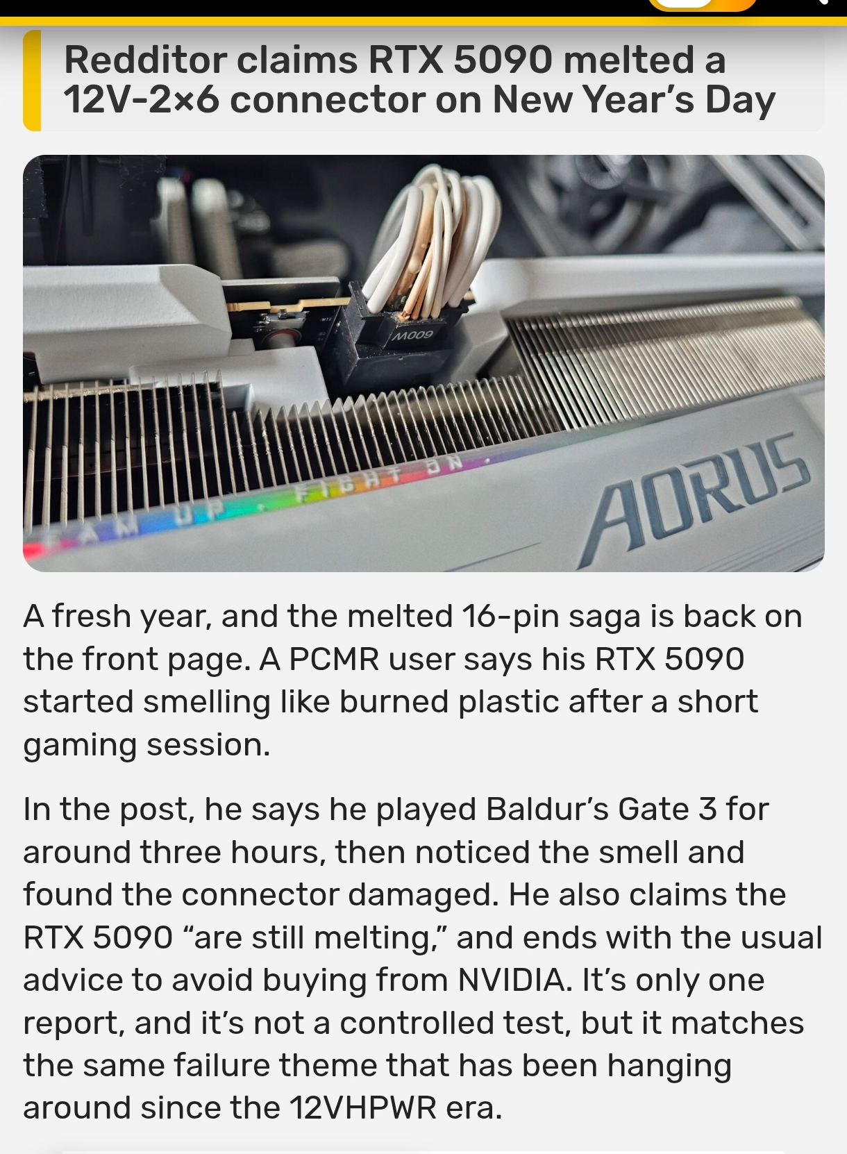 >>107736653https://www.dsogaming.com/articles/heres-what-happened-to-the-12vhpwr-power-cable-of-our-nvidia-rtx-4090-after-two-years-of-continuous-work/This is what a 4090 did to it's connector after two years of usage. Properly connected and everything done right. 5090 will be even worse since it draws significantly more power. All of them will be in the trash in 4 years or less and Nvidia will have to settle a class action.