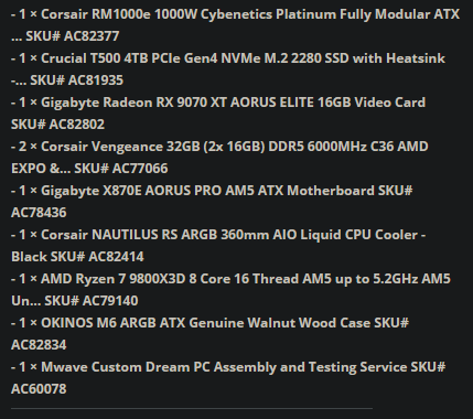 >>107745477Alright, here's an updated oneChanged 7900xtx to a 9070 and changed CPU to a 9800It's about $100 cheaper lmao