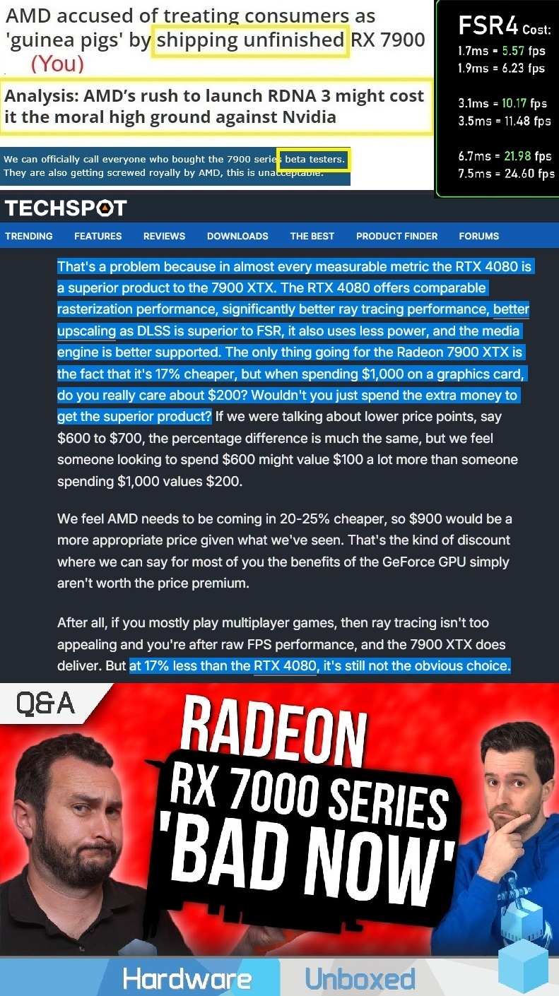 >>107746351You're talking to someone who could've purchased any high-end 7900 XTX or 9070 XT for the value of my current video card.That is your place. Even AMD Unboxed Steve advised people to pay $200 more for the RTX 4080 in his 7900 XTX launch review.