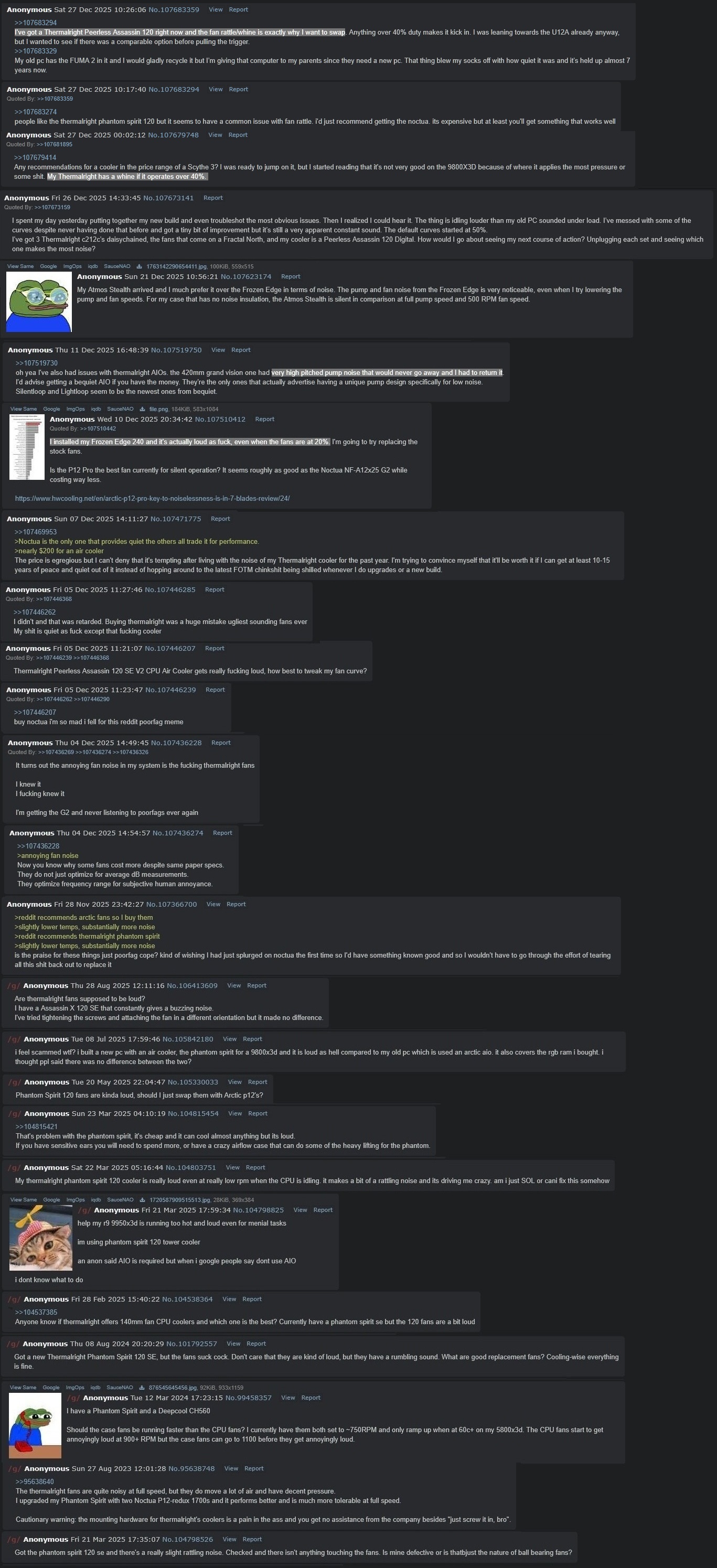 >>107748601oh yeah chinkshit is all the same to metbf it is budget chinkshit, anyone who buys that should be prepared for the fan to maybe be shit and have to swap it for another. I have random 120 fans just lying around and i assume most other people do as well, so swapping the fan should be trivial for most users.. Same thing applies to buying budget cases with included fans, there's a good chance at least one will be whiny or rattle so prepare to throw that fan in the garbage.If you need the bundled fan to be rock solid for sure on a cooler buy a noctua or something...