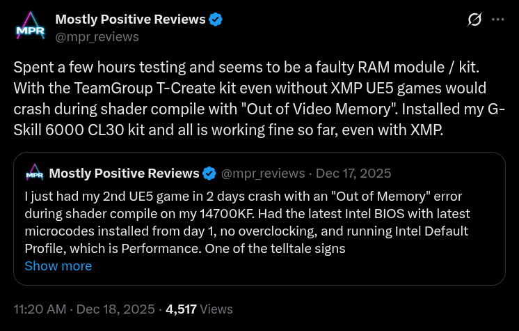 >>107748605https://x.com/BreakingDimes/status/2001425977474212306someome you replied to youre literal whotuber>I had two 14700 k's go out the same way. They were on the lastest microcode