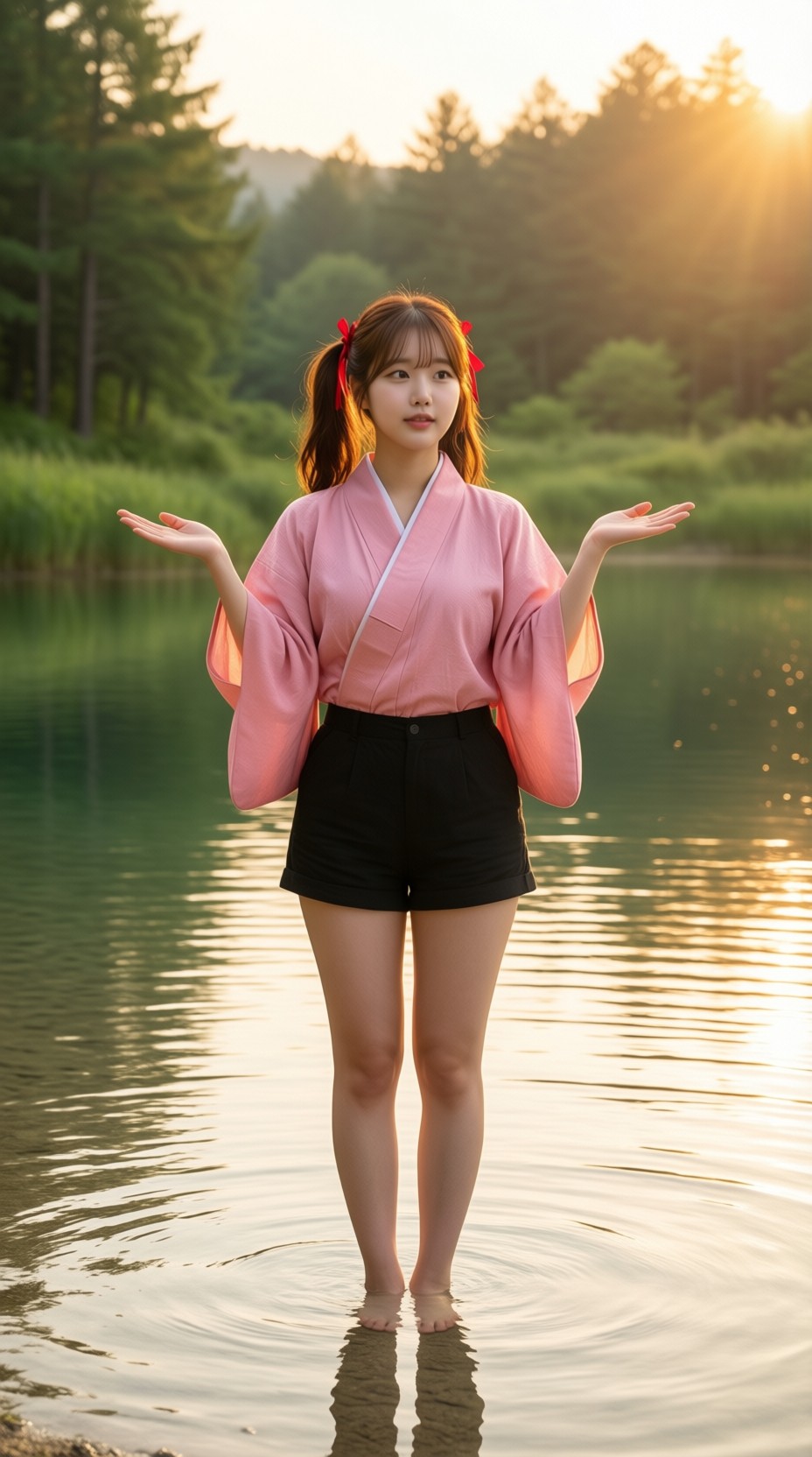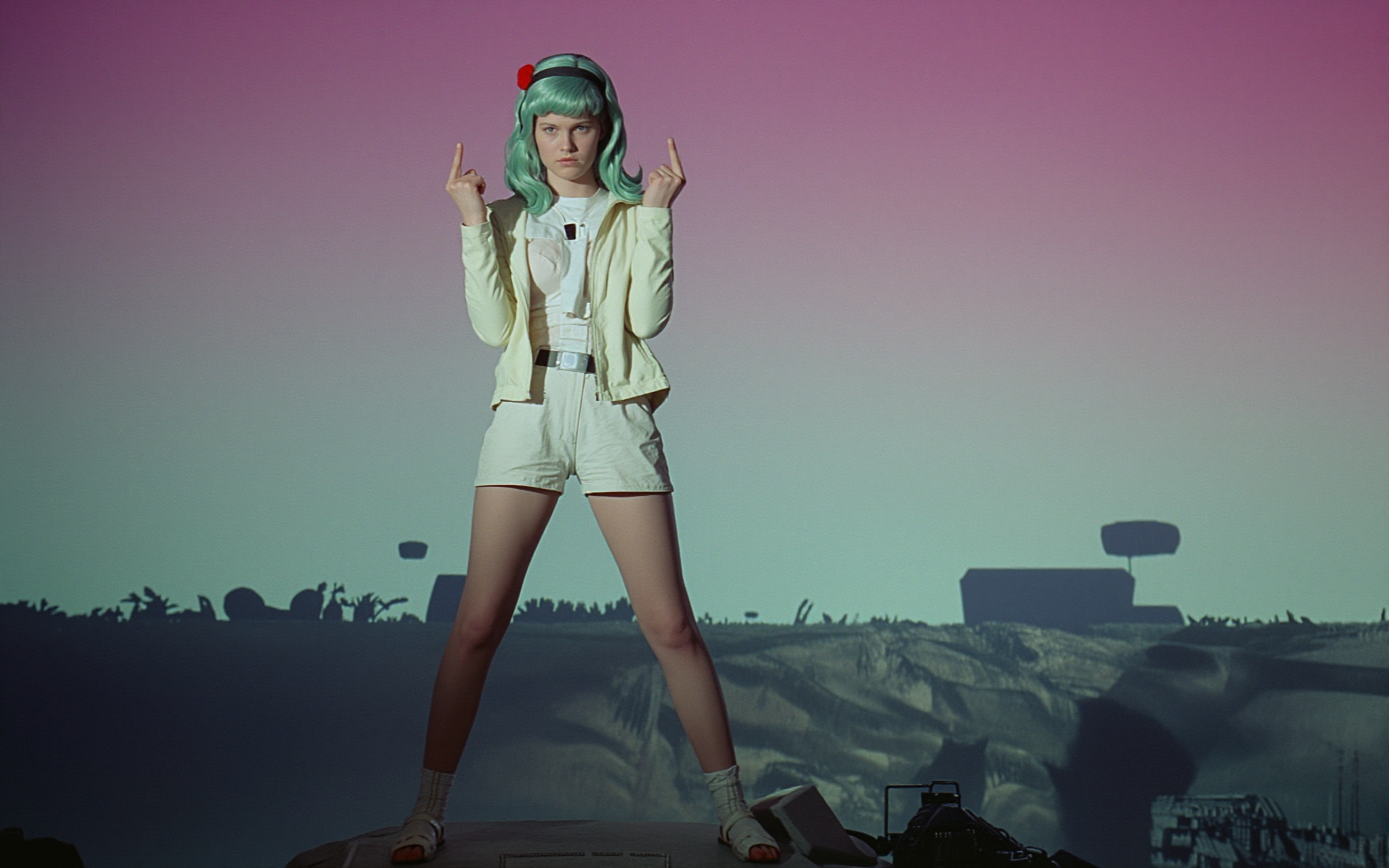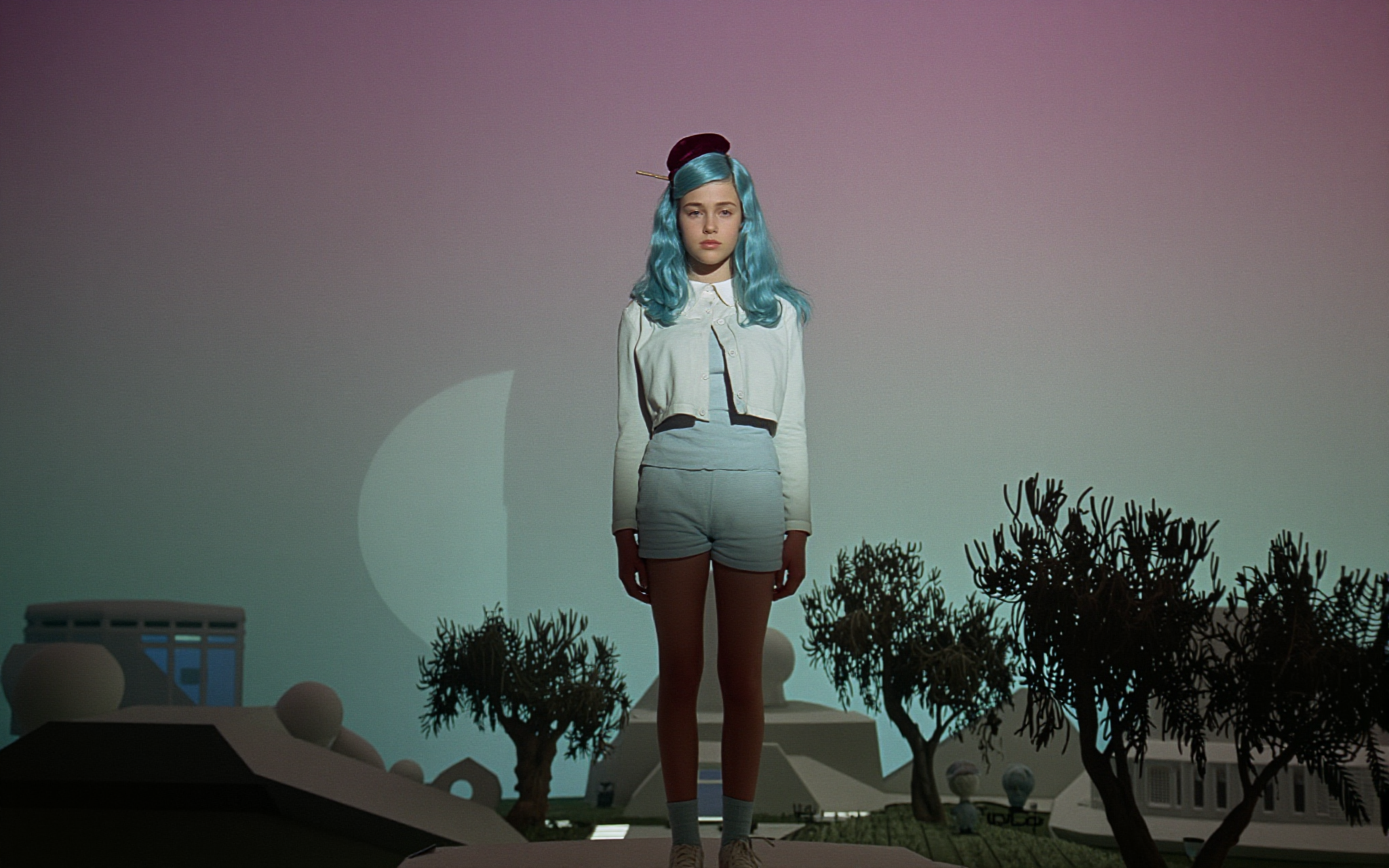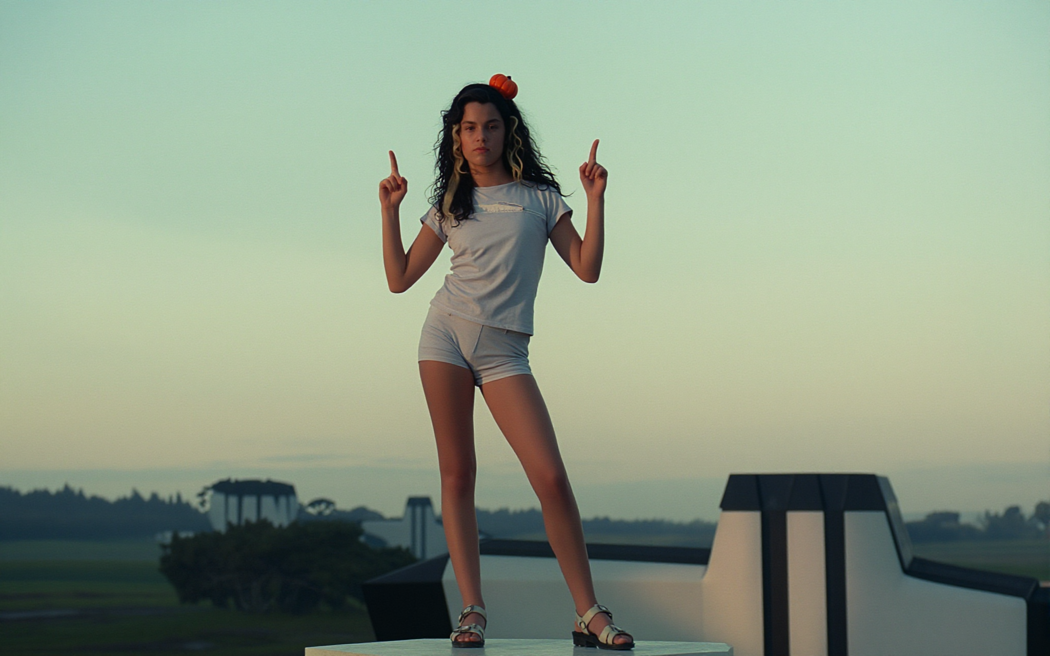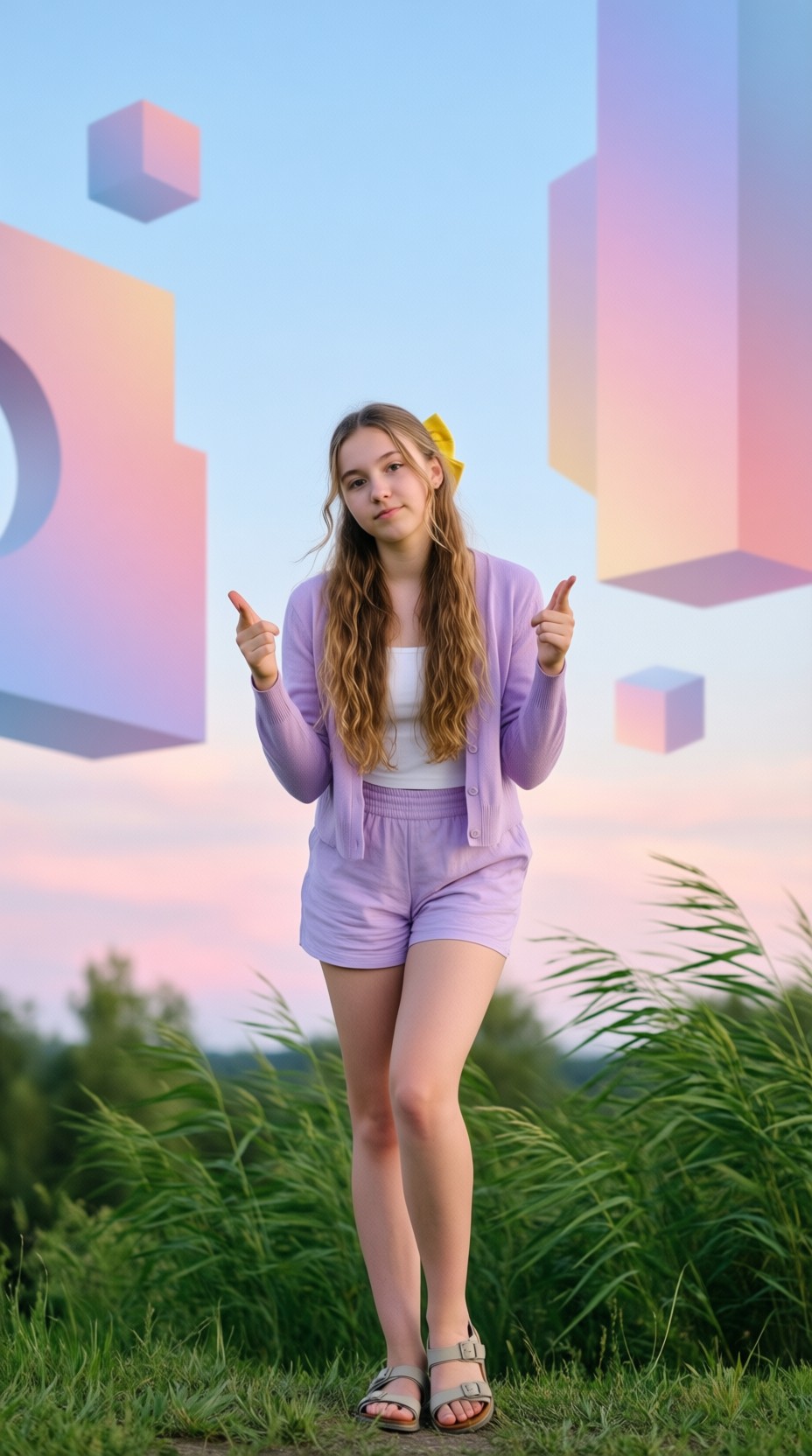 18 year old female teen, she is blonde, long wavy hair, Caucasian, slim waist, large breasts, waif, professional photography,, A young girl stands confidently against an abstract, pastel-hued backdrop featuring floating geometric shapes and soft gradients transitioning smoothly into one another. The sky above appears serene, painted with gentle hues of blue and pink, suggesting either dawn or dusk. Below, lush green foliage sways gently, adding depth and tranquility to the scene. Her outfit consists of a light purple cardigan over a white top, paired with matching shorts and simple yet stylish sandals. A small yellow accessory adorns her head, contrasting subtly with her long brown hair tied neatly at the back. She strikes a casual stance, leaning slightly forward while raising both index fingers towards herself—a gesture often associated with confidence or agreement—her gaze fixed directly ahead, embodying poise and self-assuredness.