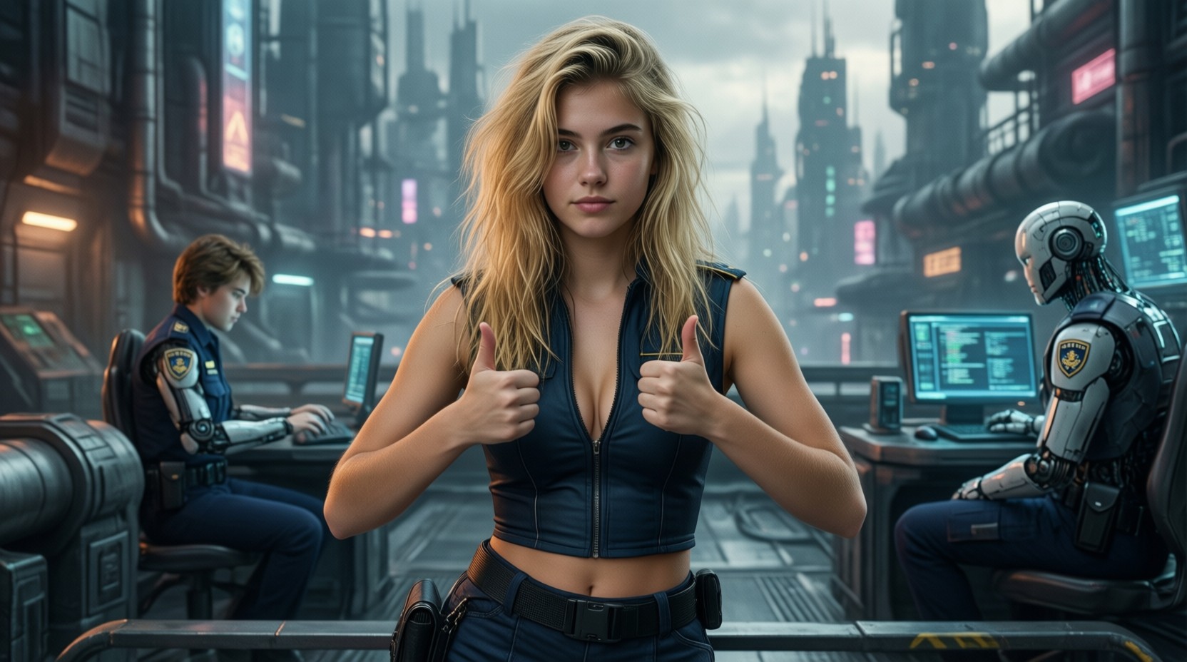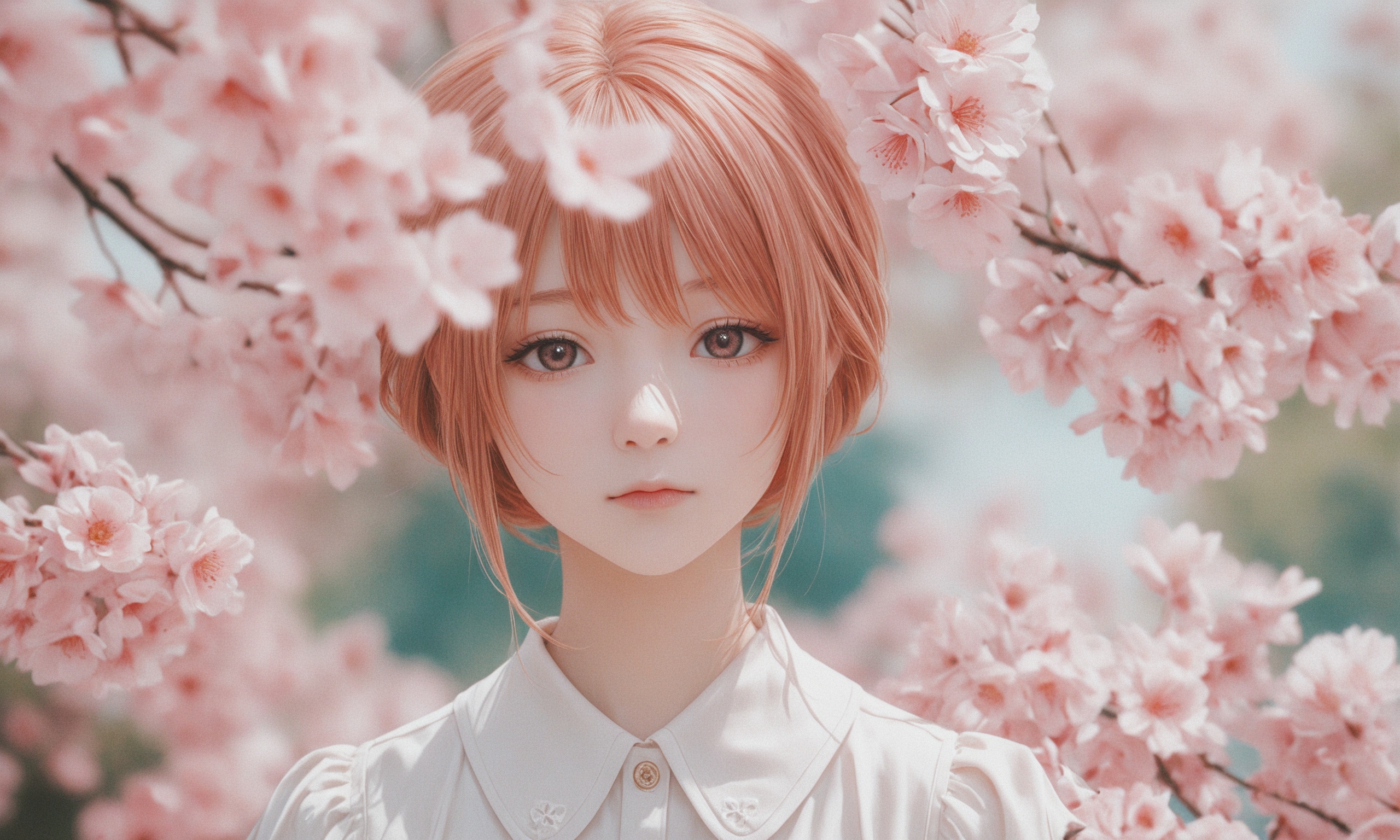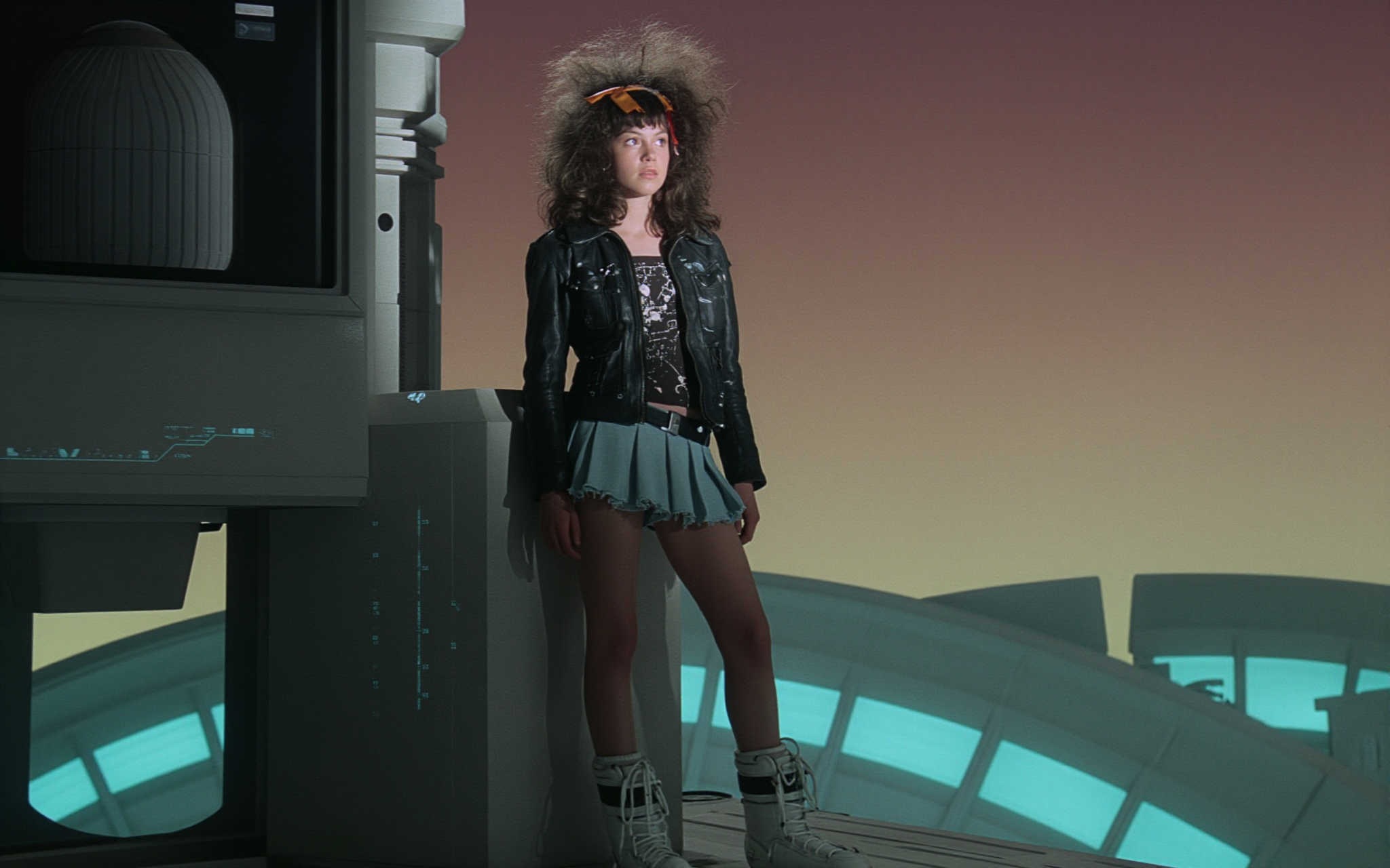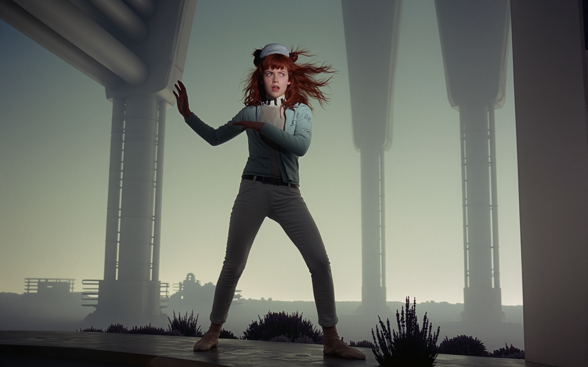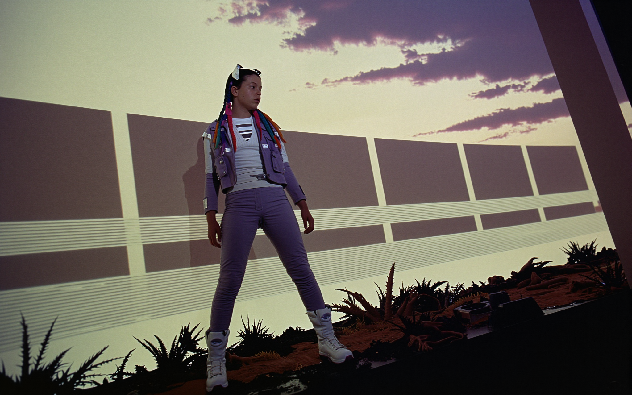 18 year old female teen, she is blonde, long wavy hair, Caucasian, slim waist, large breasts, waif, professional photography,, A young girl stands confidently against an abstract, pastel-hued backdrop featuring floating geometric shapes and soft gradients transitioning smoothly into one another. The sky above appears serene, painted with gentle hues of blue and pink, suggesting either dawn or dusk. Below, lush green foliage sways gently, adding depth and tranquility to the scene. Her outfit consists of a light purple cardigan over a white top, paired with matching shorts and simple yet stylish sandals. A small yellow accessory adorns her head, contrasting subtly with her long brown hair tied neatly at the back. She strikes a casual stance, leaning slightly forward while raising both index fingers towards herself—a gesture often associated with confidence or agreement—her gaze fixed directly ahead, embodying poise and self-assuredness.
