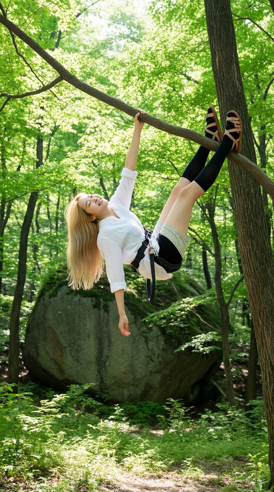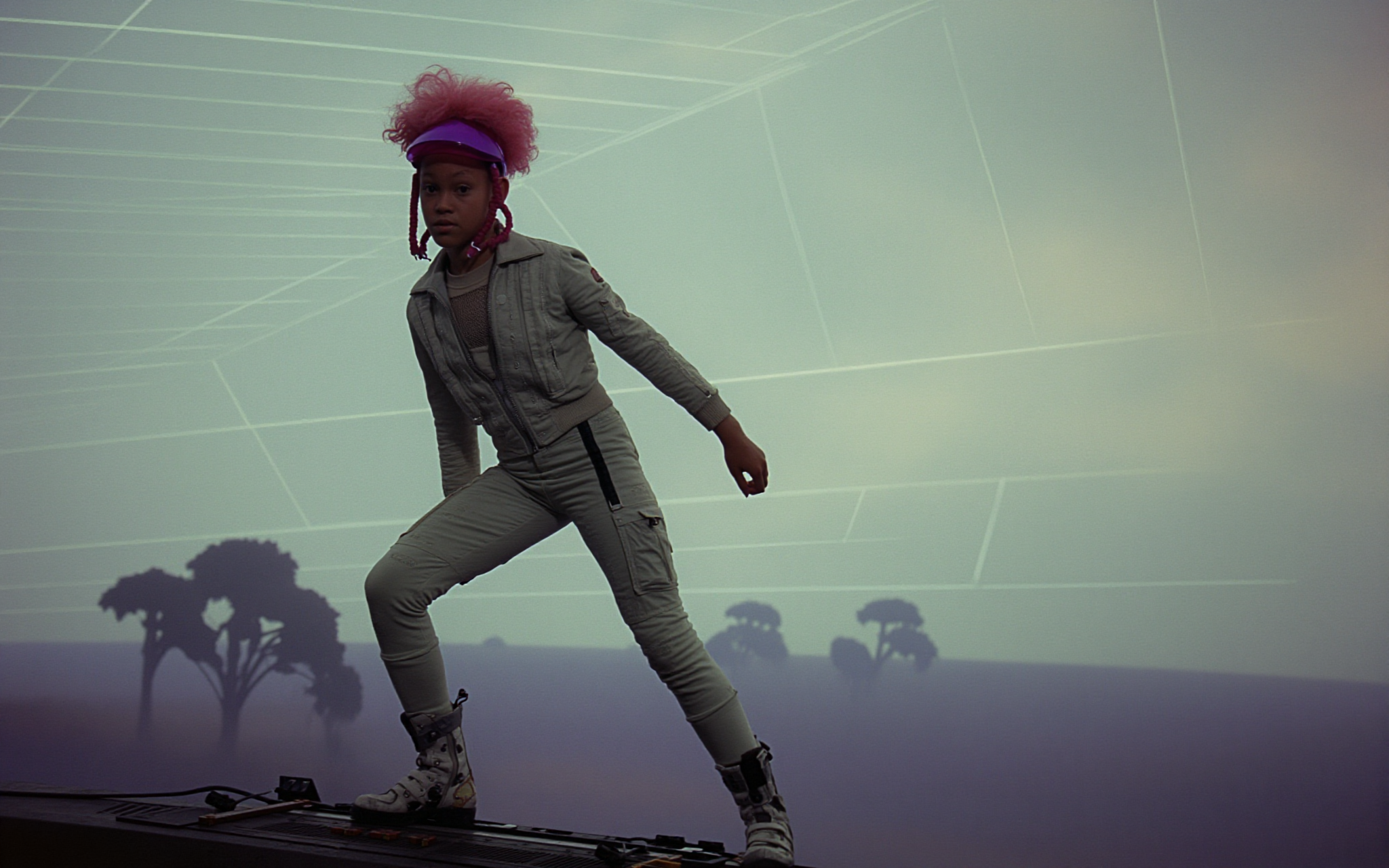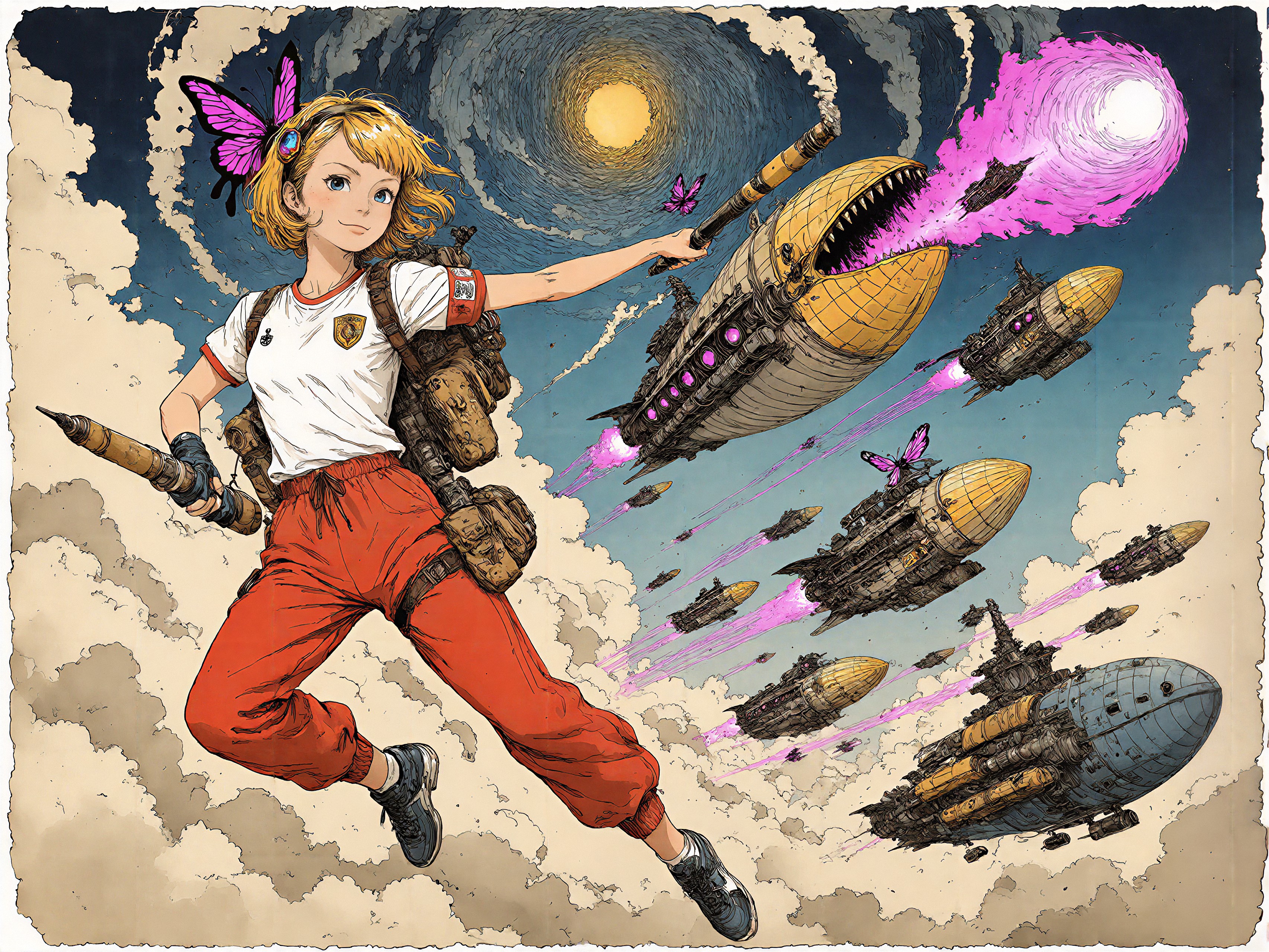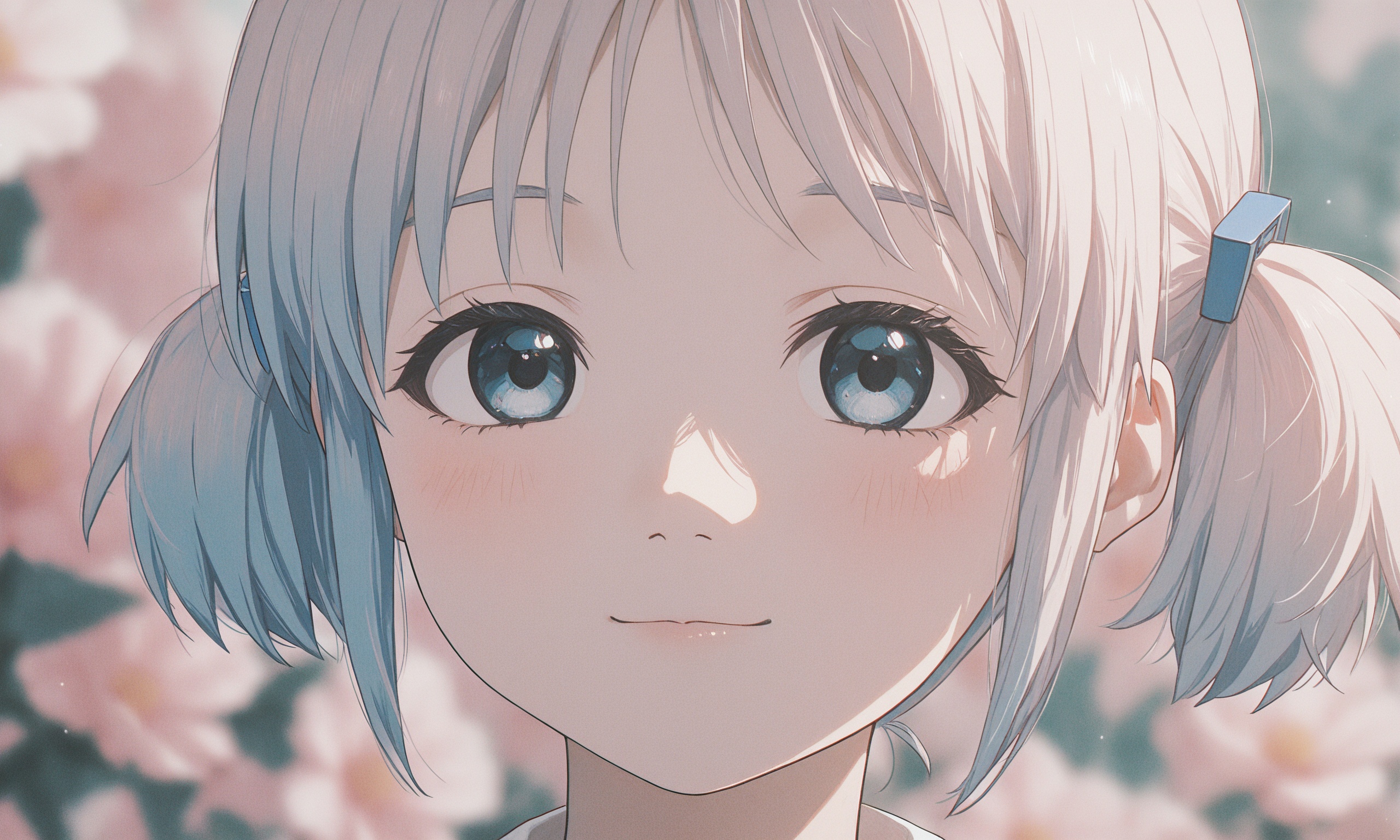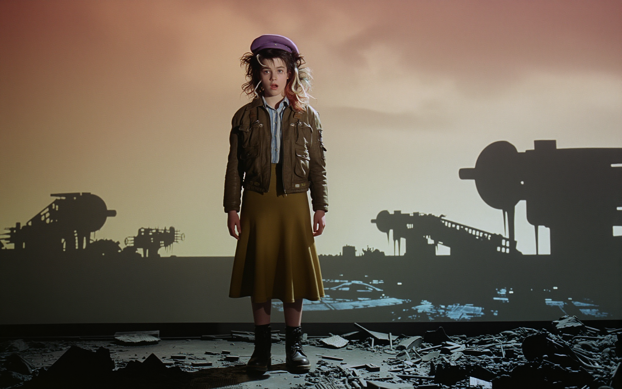 18 year old female teen, she is blonde, long wavy hair, Caucasian, slim waist, large breasts, waif, professional photography,, A young girl stands confidently against an abstract, pastel-hued backdrop featuring floating geometric shapes and soft gradients transitioning smoothly into one another. The sky above appears serene, painted with gentle hues of blue and pink, suggesting either dawn or dusk. Below, lush green foliage sways gently, adding depth and tranquility to the scene. Her outfit consists of a light purple cardigan over a white top, paired with matching shorts and simple yet stylish sandals. A small yellow accessory adorns her head, contrasting subtly with her long brown hair tied neatly at the back. She strikes a casual stance, leaning slightly forward while raising both index fingers towards herself—a gesture often associated with confidence or agreement—her gaze fixed directly ahead, embodying poise and self-assuredness.
