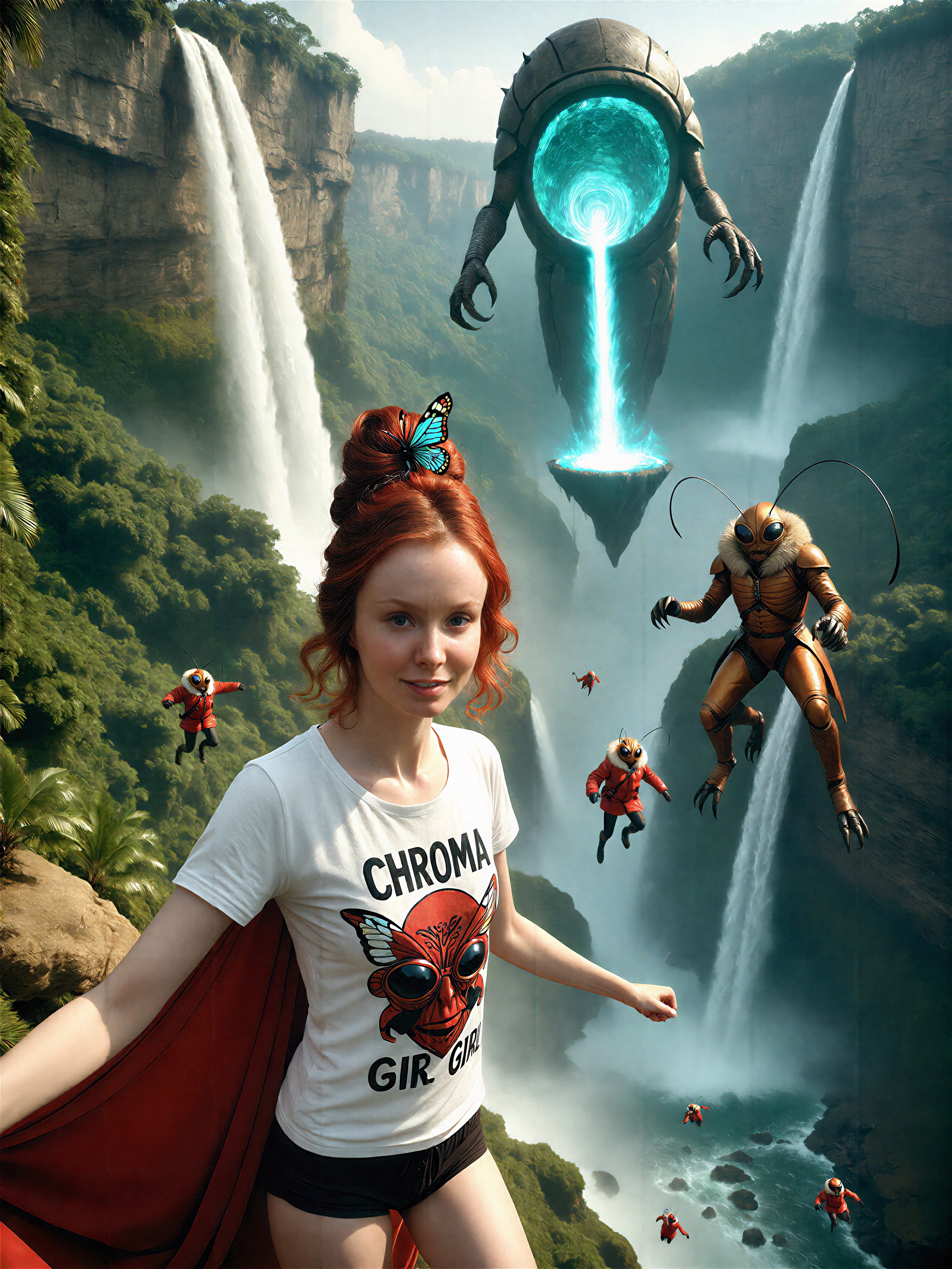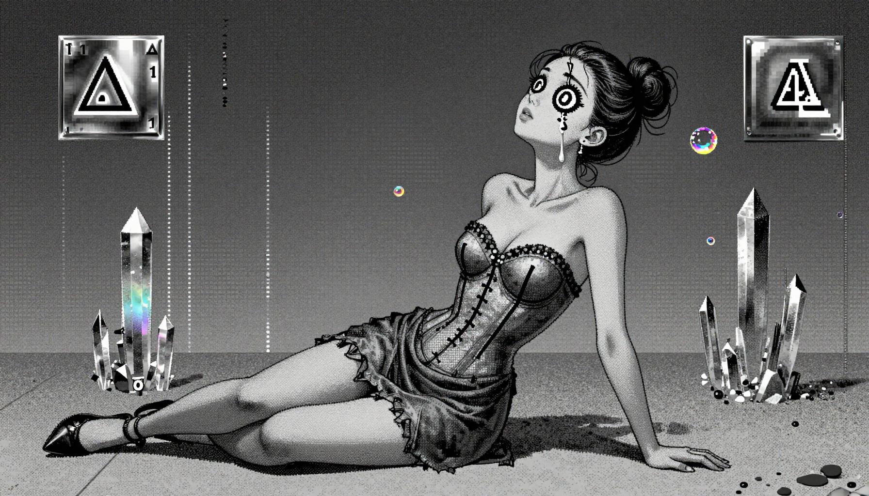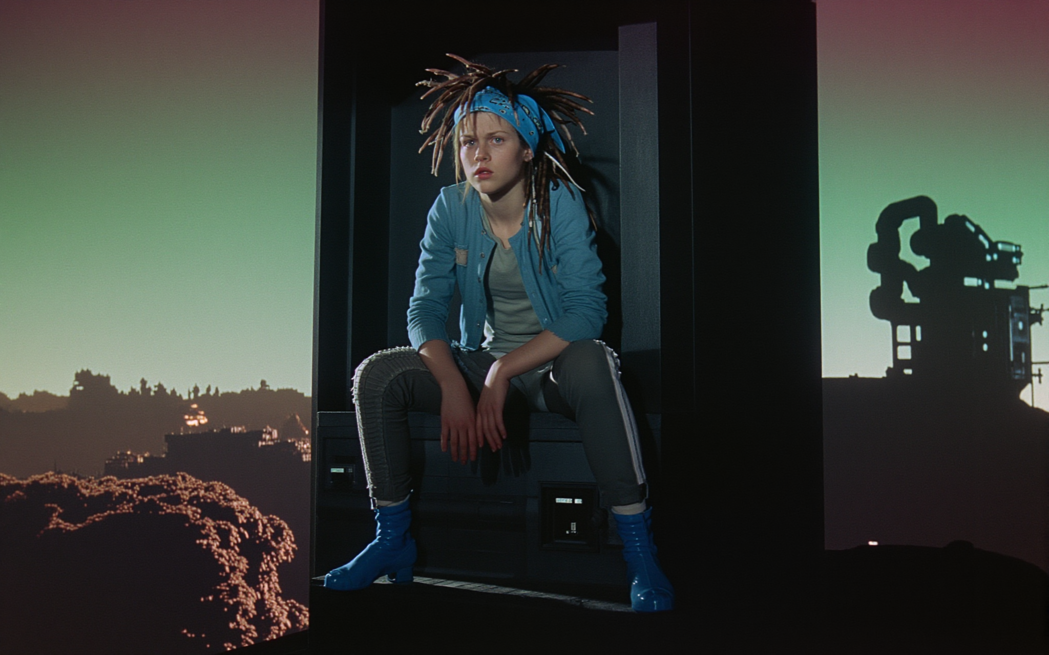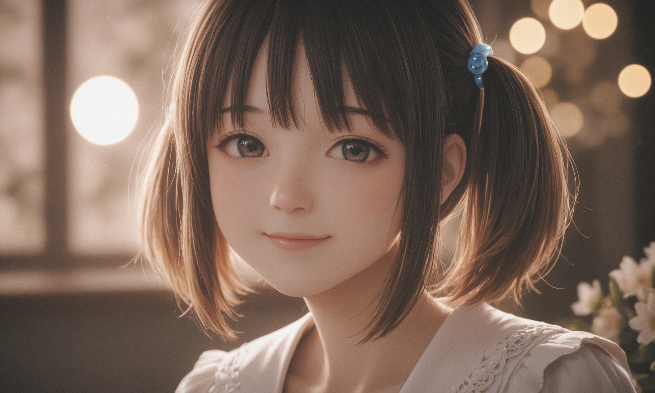 18 year old female teen, she is blonde, long wavy hair, Caucasian, slim waist, large breasts, waif, professional photography,, A young girl stands confidently against an abstract, pastel-hued backdrop featuring floating geometric shapes and soft gradients transitioning smoothly into one another. The sky above appears serene, painted with gentle hues of blue and pink, suggesting either dawn or dusk. Below, lush green foliage sways gently, adding depth and tranquility to the scene. Her outfit consists of a light purple cardigan over a white top, paired with matching shorts and simple yet stylish sandals. A small yellow accessory adorns her head, contrasting subtly with her long brown hair tied neatly at the back. She strikes a casual stance, leaning slightly forward while raising both index fingers towards herself—a gesture often associated with confidence or agreement—her gaze fixed directly ahead, embodying poise and self-assuredness.