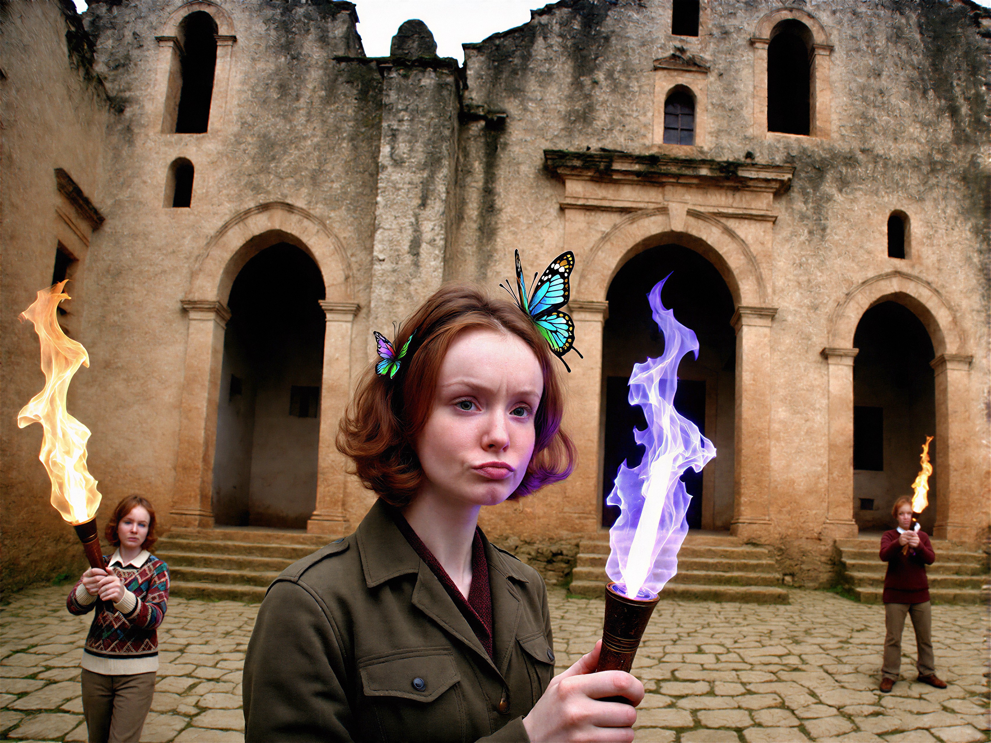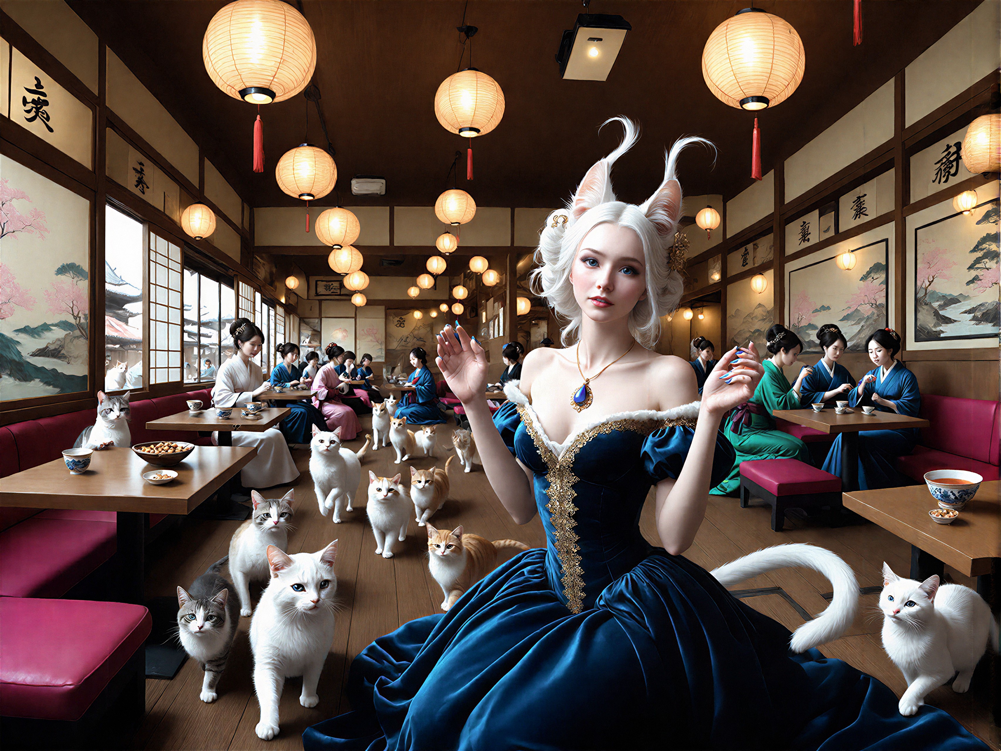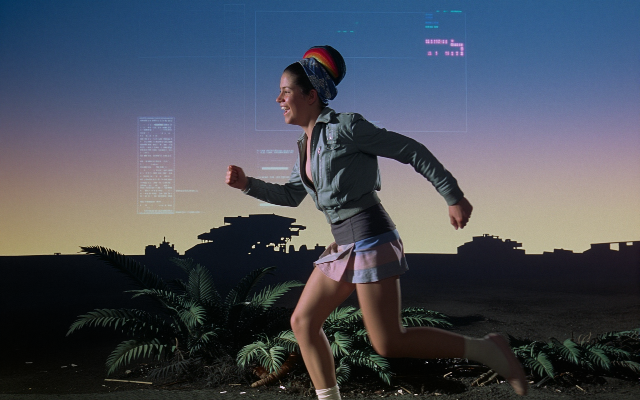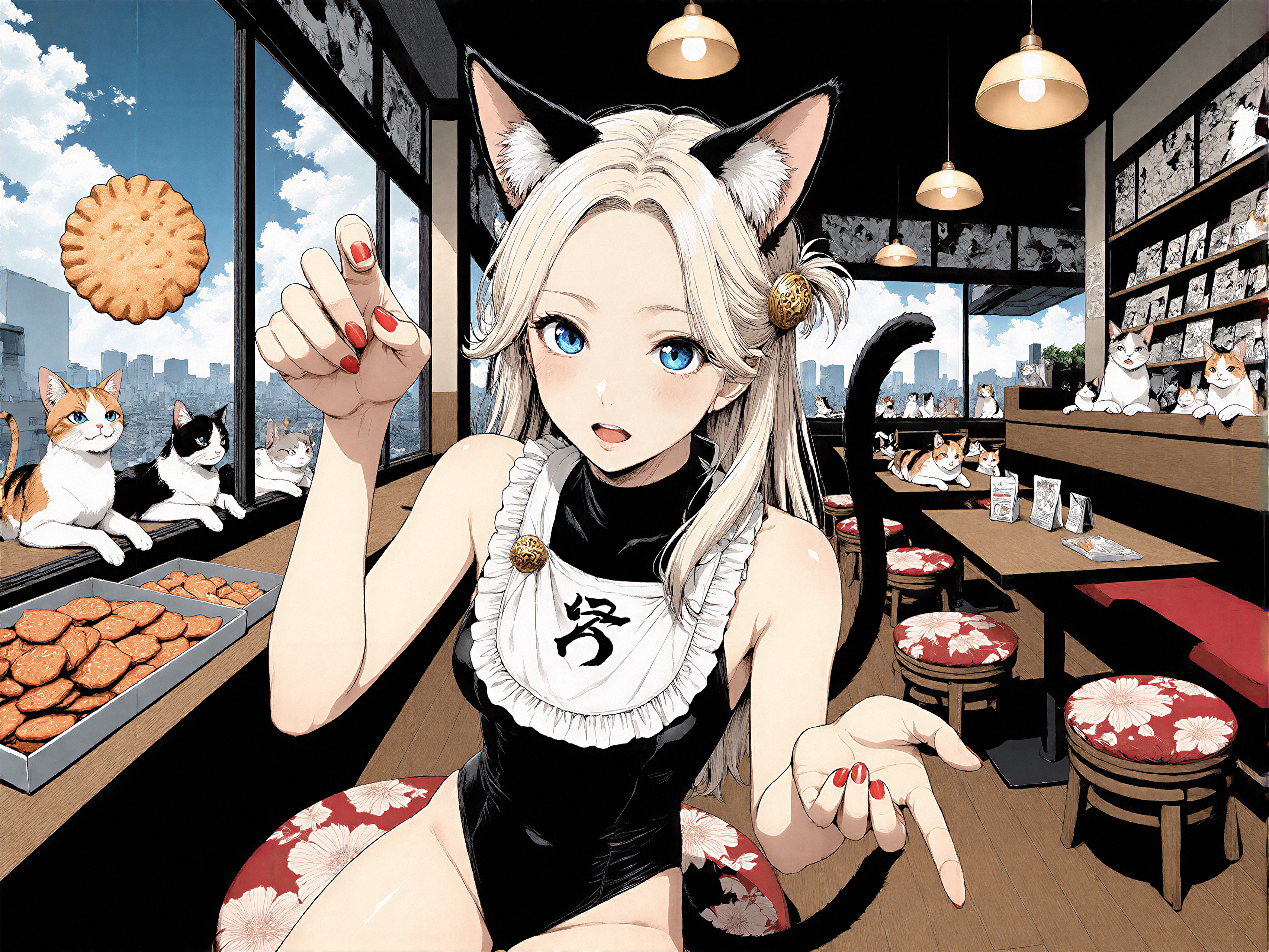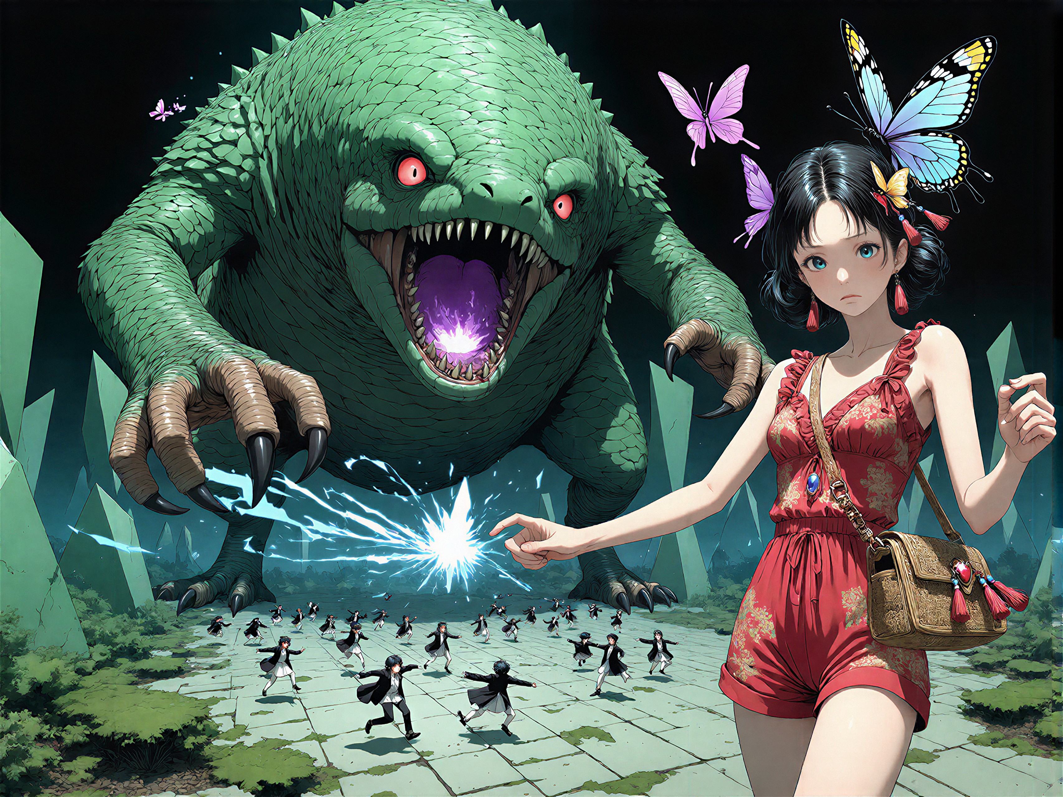 18 year old female teen, she is blonde, long wavy hair, Caucasian, slim waist, large breasts, waif, professional photography,, A young girl stands confidently against an abstract, pastel-hued backdrop featuring floating geometric shapes and soft gradients transitioning smoothly into one another. The sky above appears serene, painted with gentle hues of blue and pink, suggesting either dawn or dusk. Below, lush green foliage sways gently, adding depth and tranquility to the scene. Her outfit consists of a light purple cardigan over a white top, paired with matching shorts and simple yet stylish sandals. A small yellow accessory adorns her head, contrasting subtly with her long brown hair tied neatly at the back. She strikes a casual stance, leaning slightly forward while raising both index fingers towards herself—a gesture often associated with confidence or agreement—her gaze fixed directly ahead, embodying poise and self-assuredness.