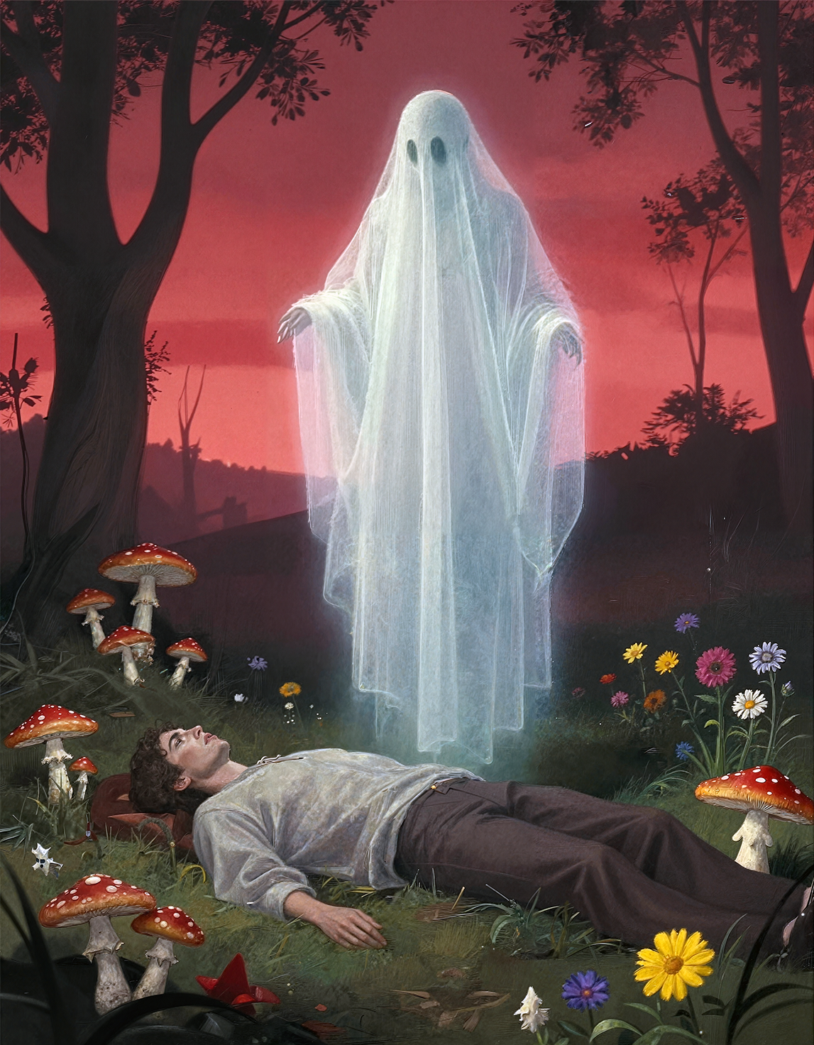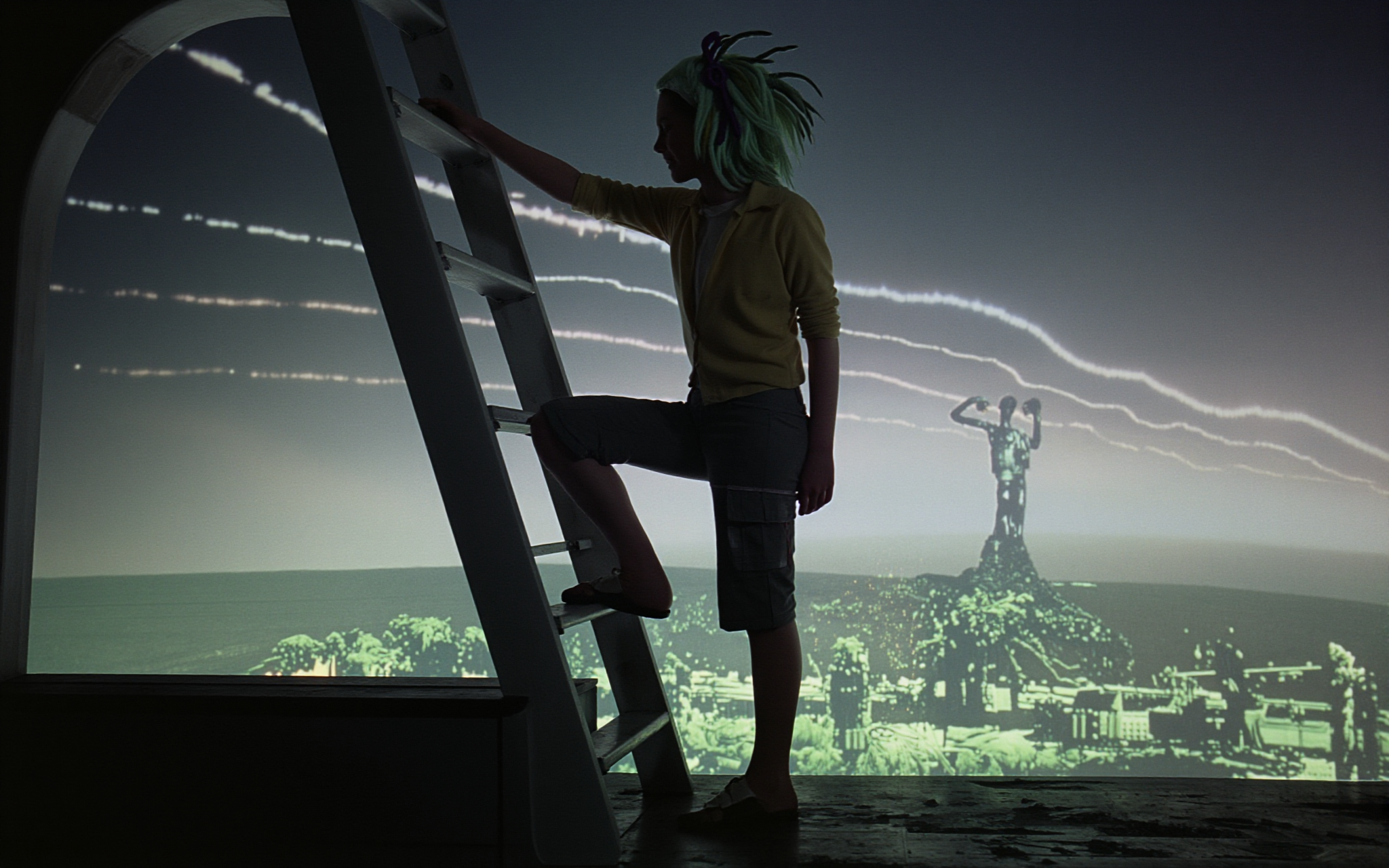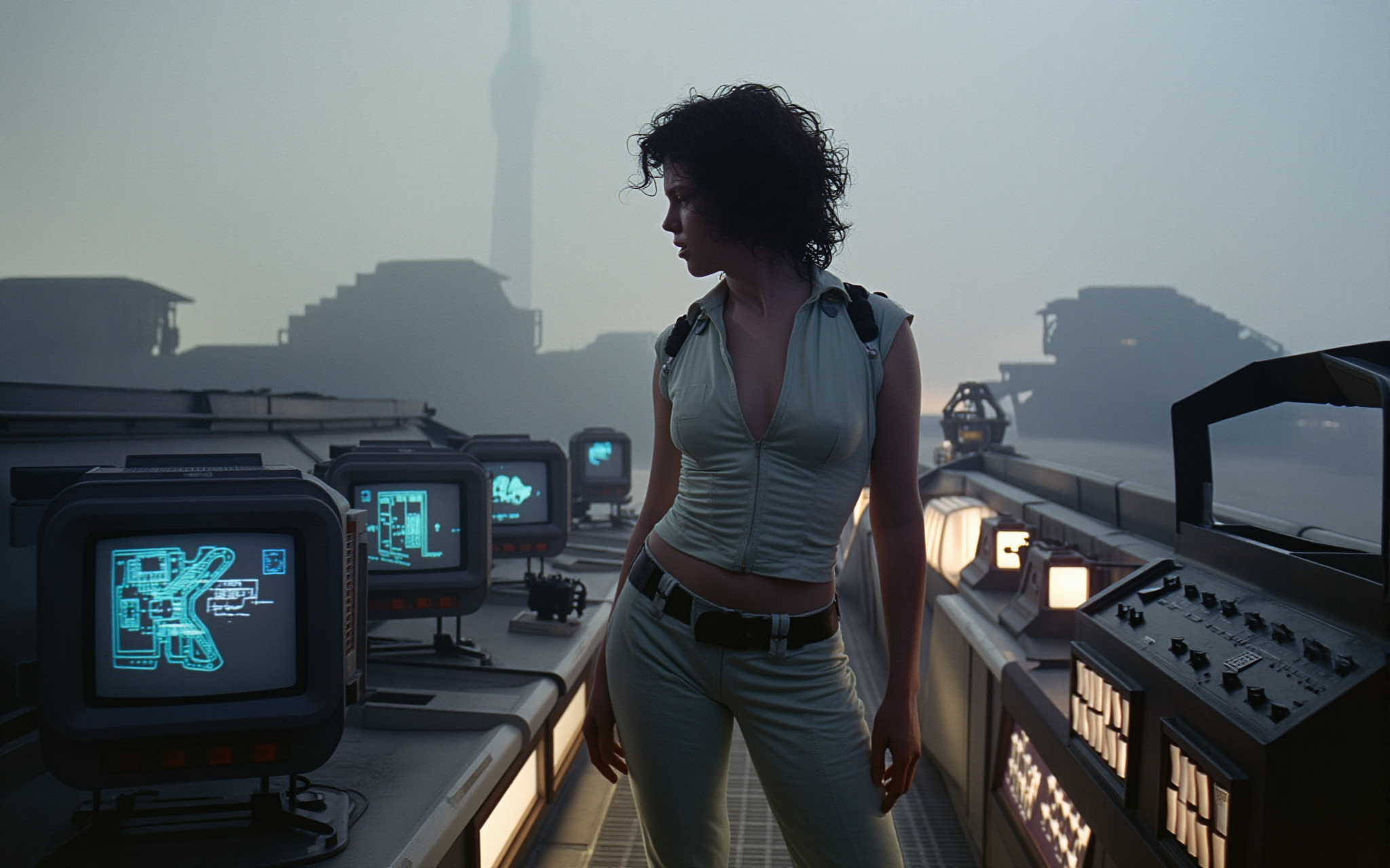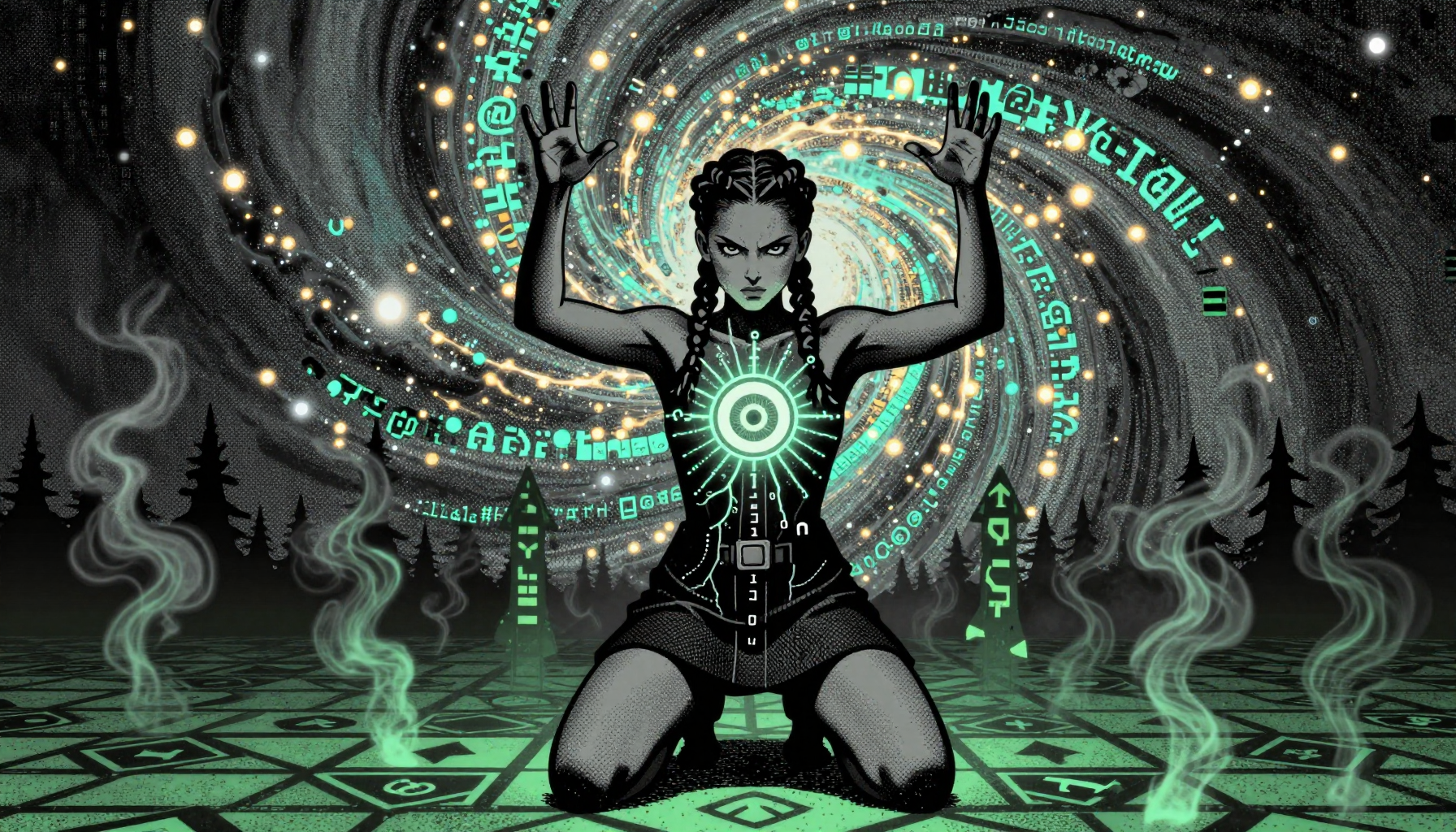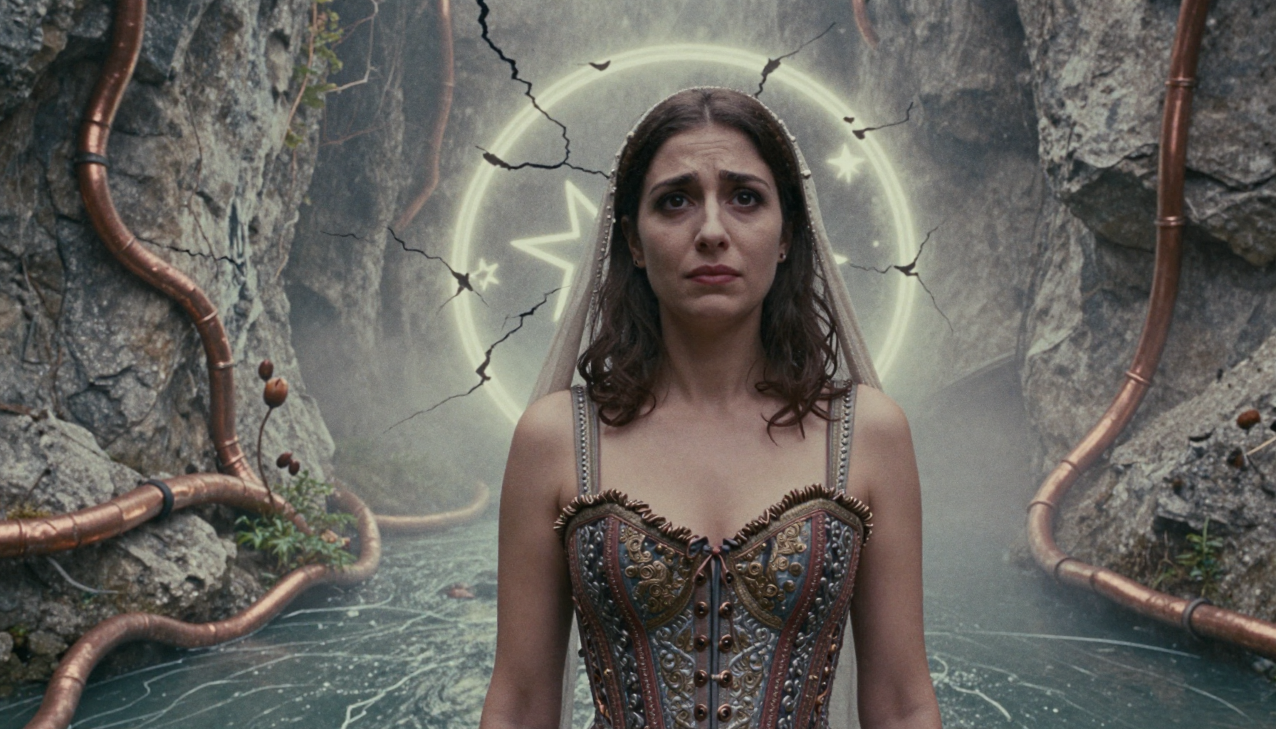18 year old female teen, she is blonde, long wavy hair, Caucasian, slim waist, large breasts, waif, professional photography,, A young girl stands confidently against an abstract, pastel-hued backdrop featuring floating geometric shapes and soft gradients transitioning smoothly into one another. The sky above appears serene, painted with gentle hues of blue and pink, suggesting either dawn or dusk. Below, lush green foliage sways gently, adding depth and tranquility to the scene. Her outfit consists of a light purple cardigan over a white top, paired with matching shorts and simple yet stylish sandals. A small yellow accessory adorns her head, contrasting subtly with her long brown hair tied neatly at the back. She strikes a casual stance, leaning slightly forward while raising both index fingers towards herself—a gesture often associated with confidence or agreement—her gaze fixed directly ahead, embodying poise and self-assuredness.