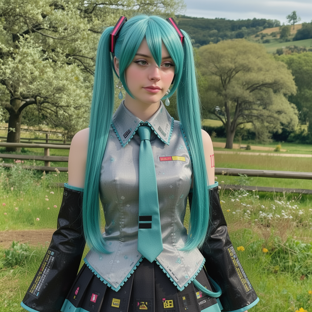 change the girl's hair to be turquoise twin tales likes hatsune miku. change the girl's outfit to be hatsune miku's outfit. keep her pose and expression the sameflux 2 with 8 step turbo lora