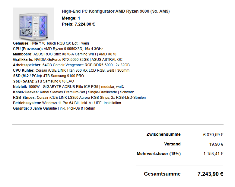 >>107753073>Probably could've saved $2-2.5k doing it yourself.Not really. I looked up the current prices for the new parts if I wanted to build it myself.>Hyte monitor meme case524€>9950X3D649€>Anus Mainboard315€>64gb RAM800€ (lmao)>Anus Astral 5090 OC4000€>CPU AIO200€>SSDM2500€>SSDSATA215€>PS150€>Gamer LED stripes and sleeves150€So 7500€Maybe I could have saved a couple hundred if I had searched for deals or bought pre owned but it is what it is.>>107753097I have hopeium.