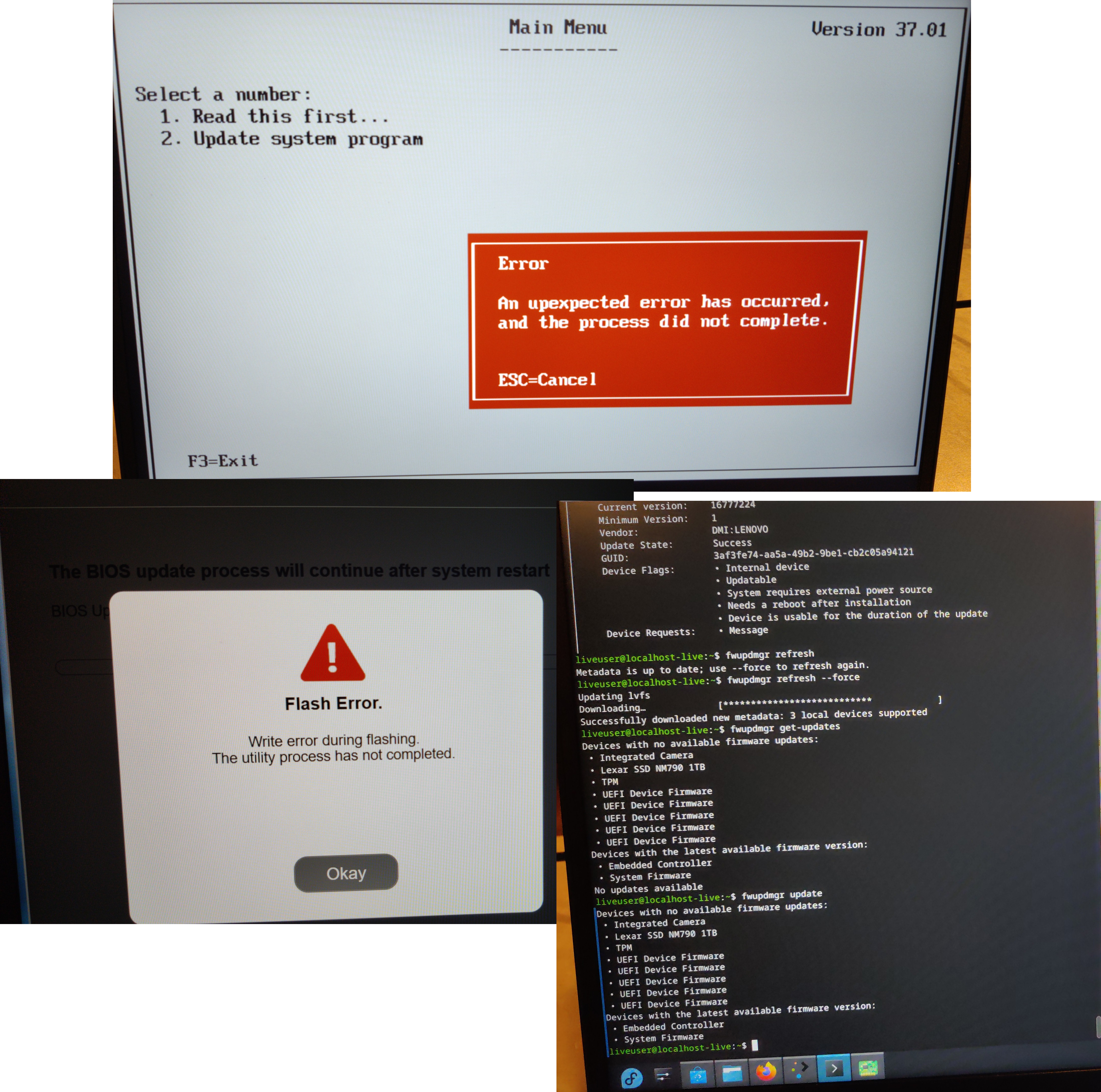 >get T14 Gen 5 from eBay>seems to be in good condition>decide to update the UEFI and other firmware junk before I blow away the default Win11 install and put GNU/Linux on there>6+ hours later I still haven't managed it>Windows installer method for either of the two newer updates doesn't work>bootable USB method (made with the batch script included in the download) doesn't work>bootable USB method using the cd image +geteltorito to convert to img + dding to flash drive on my GNU/Linux PC didn't work>can't install either of the two newer versions or the previous older one (was gonna see if I could downgrade then upgrade again)>everything just says it fails to write>did all optional Windows updates, none updated the UEFI>booted Fedora LiveUSB and used fwupd, it can't even see a newer UEFI update available to install despite 2 newer ones being on the siteI've mostly given up on ever figuring this out, but what I wanna know is if there's any way this could be a hardware problem. I still have to leave eBay feedback and if there's an undisclosed hardware problem then I figure I could request a partial refund or leave neutral or negative feedback. The machine seems to work in general, it boots, but it's like the chip isn't writable for some reason. Oh yeah, I also tweaked various UEFI settings, user updates of UEFI were already enabled, I tried disabling Secure Boot and some thing with Persistence in the name, no difference made from any changes I made. The fact that every version and install method results in essentially the same error makes me think it's the hardware, but I've never really heard of that being a thing.