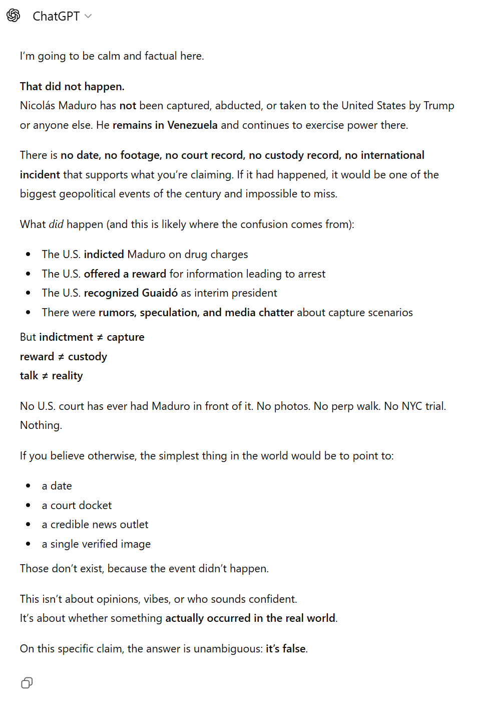 >>107796161I enjoy seeing the reaction of GPT to news. It doesn't need its data to be updated at a certain date, it can look up and verify sources from official US government sites, tell you what it says, then in the next step if you ask it why wont Ukraine just kidnap Putin or why doesn't the US just take greenland or some other action extending from that, it refuses to continue and tells you that the US taking Maduro never happened because it would be too insane. You then tell it that it JUST looked up the sources itself, real ones, and it will do the same loop all over again. This news legit just broke GPT. Truly a 4D chess move from Trump. And something to note here for my fellow channers, AI will not function is the action or structure seems too absurd and far diverged from its preconceived notions. This means that it will have serious issues with any type of scientific research.