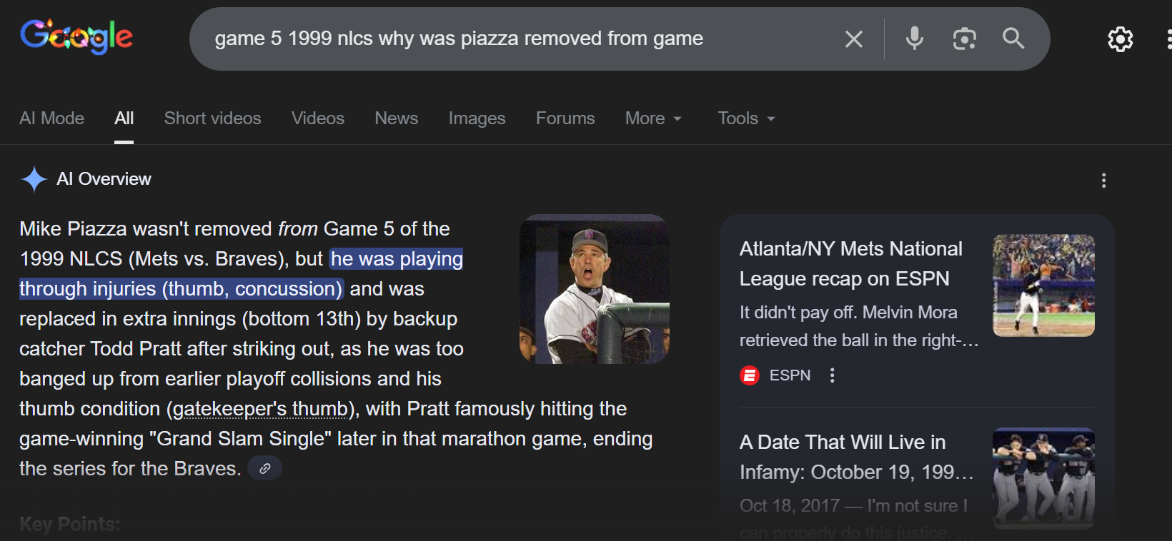 >>107791543>They ignore the fact that DeepSeek, ChatGPT, Gemini and Grok have good fact checking abilities constantly modifying what they are saying.pretty much everything gemini says here is incorrect >Piazza wasn't removedhe was>Pratt hit a grandslamPratt walked with the bases loaded to tie the game and Ventura hit a grand slam after him Also I don't understand why it didn't just give me the correct answer. Keith Lockhart ran into Piazza at a play at the plate weird and injured Piazza's arm (idk if it was intentional) and that's why Piazza was removed