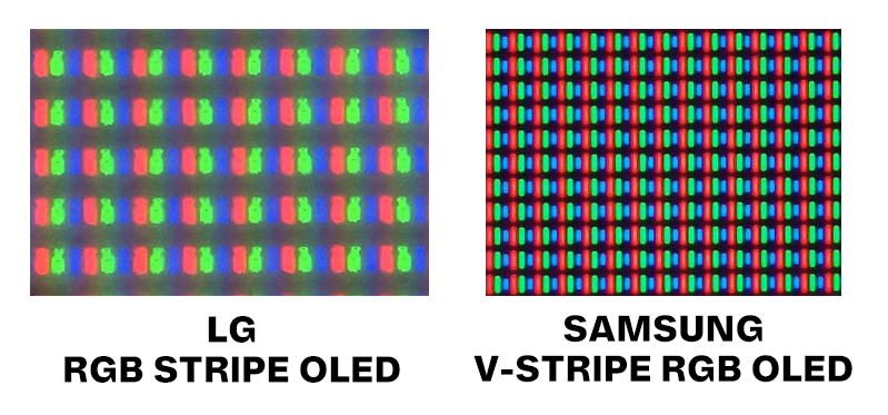 RGB OLED UPDATE:https://www.youtube.com/watch?v=3nNerw97PVU&t=96shttps://www.youtube.com/watch?v=ziieoRhhekshttps://www.youtube.com/watch?v=3nNerw97PVUSubpixel layout on LG's 4K RGB OLED panel photographed.They did the logical thing and may all the R, G, & B subpixels the same size like LCDs and in oppostion to the V-Stripe layout Samsung did where each subpixel is of slightly different heights. I will be curious to see if this manifests any differences in text clarity or other changes when both are released. Also HUBTim states that eventually they hope to have LG's 4K RGB OLED TrueBlack500-certified (meaning ~300 nits full field) despite the loss of the White subpixel. DisplayGuy brought a meter to the CES floor and measured the pre-production unit ASUS had on display at a little over ~200 nits full-field.