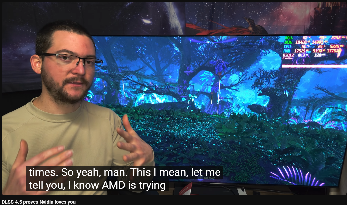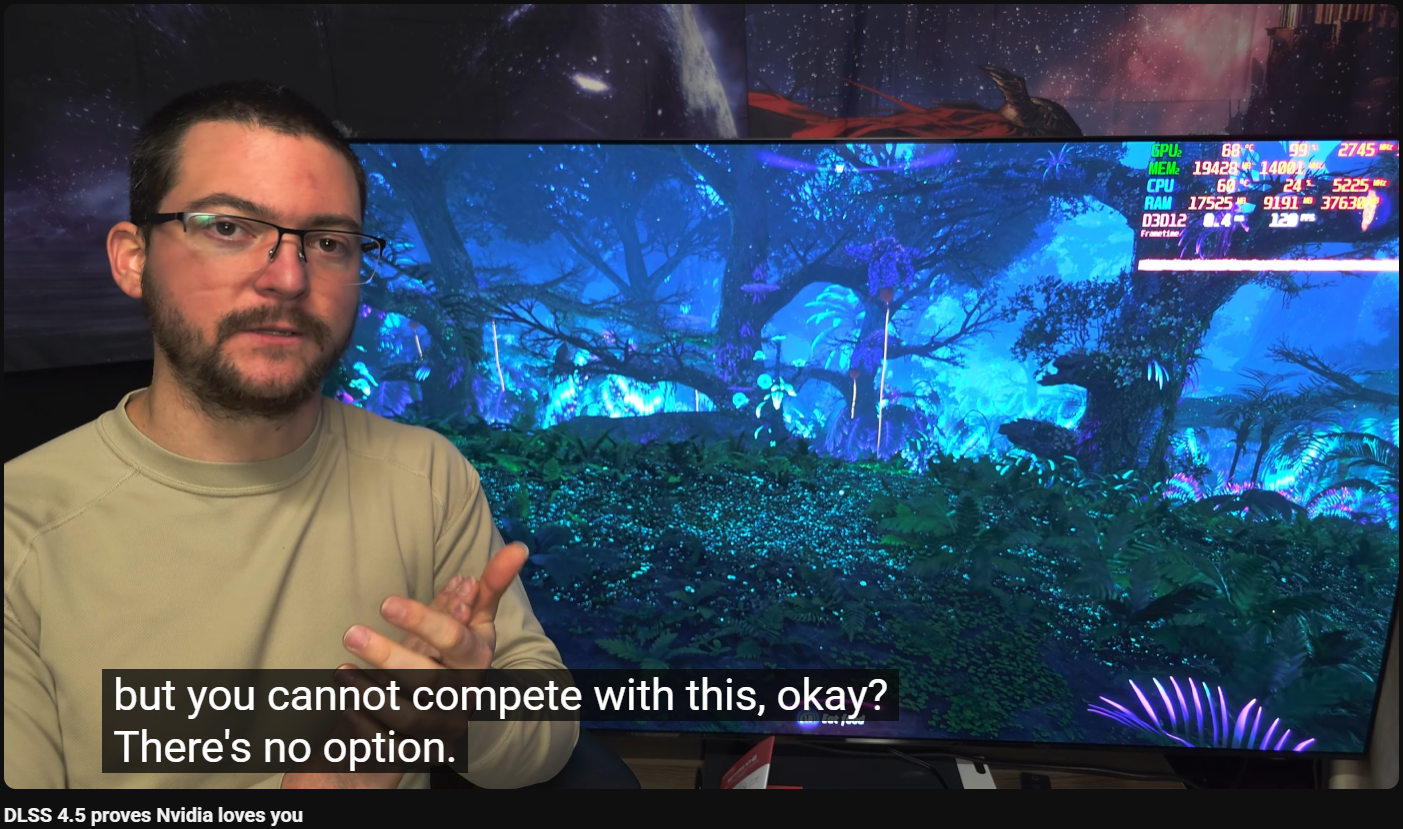 Nvidias biggest glazer hyperglazes DLSS4.5Protip if you aren't using the best displays possible aka large oled TVs, you can't critique DLSS being a smallscreen cuckJensen won>>107790221>>107790135
