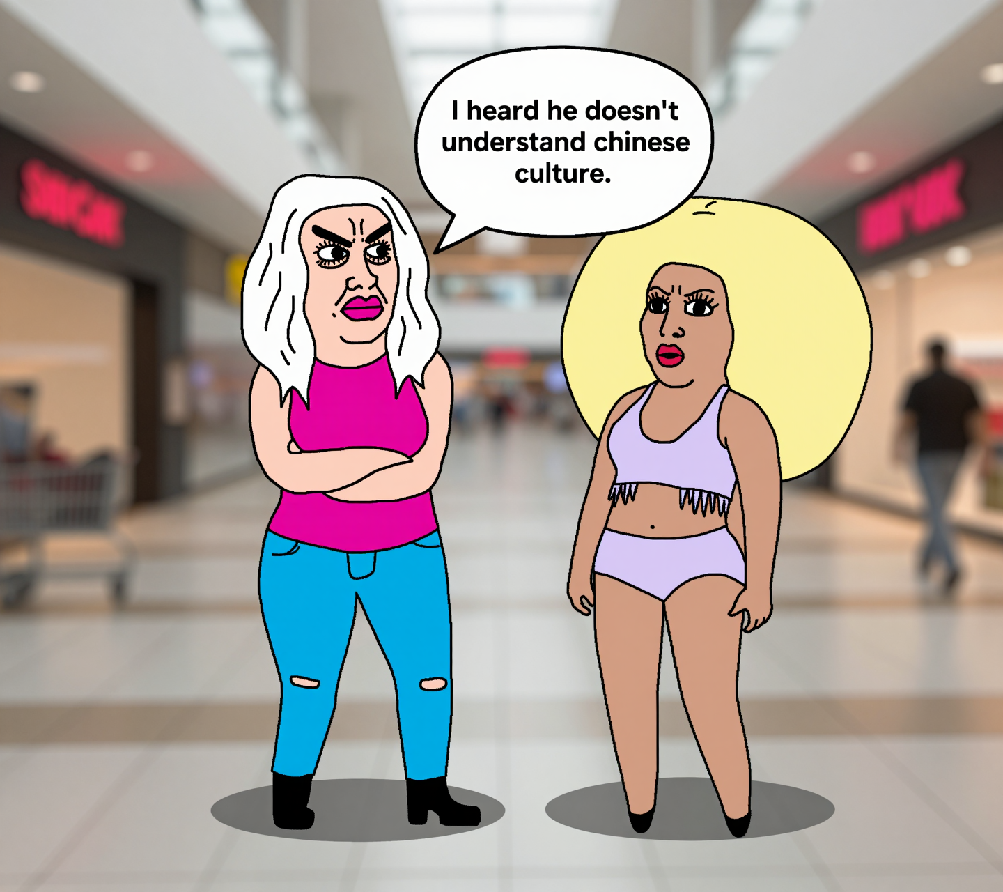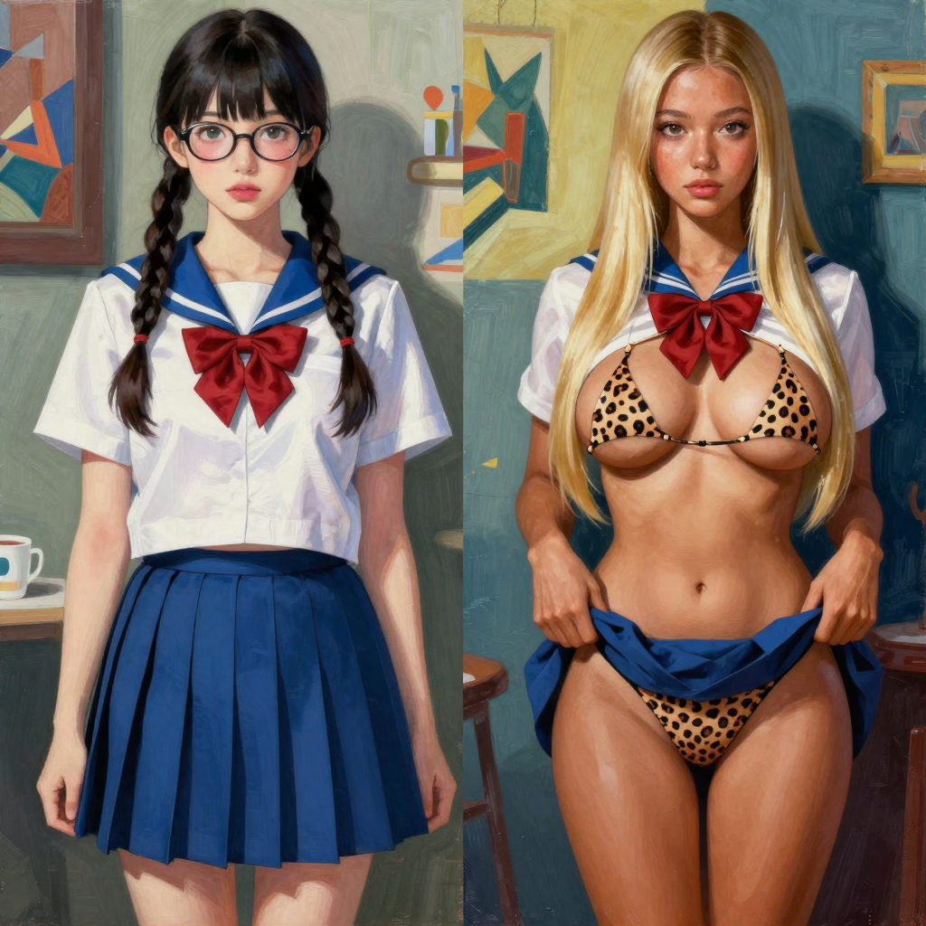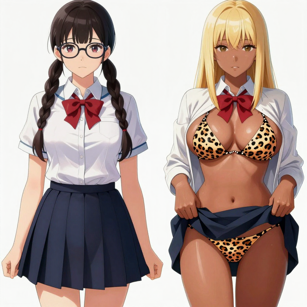 >>107815383zimageon the left japanese girl in glasses school uniform twin braids red bow blue skirt, on the right the same girl same school uniform but with straight blonde hair larger breasts open shirt with leopard bra two triangles on a string underneath skirt pulled up with leopard panties visible underneath same red bow, dark tanned skin