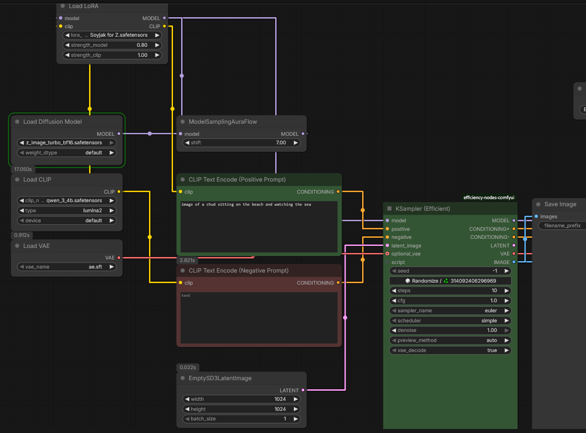 >>107813289Kinda difficult to tell how everything is connected there.Does your "load diffusion model" connect to your "load lora" node and then go to the "modelsamplingauraflow" which then goes to ksampler?
