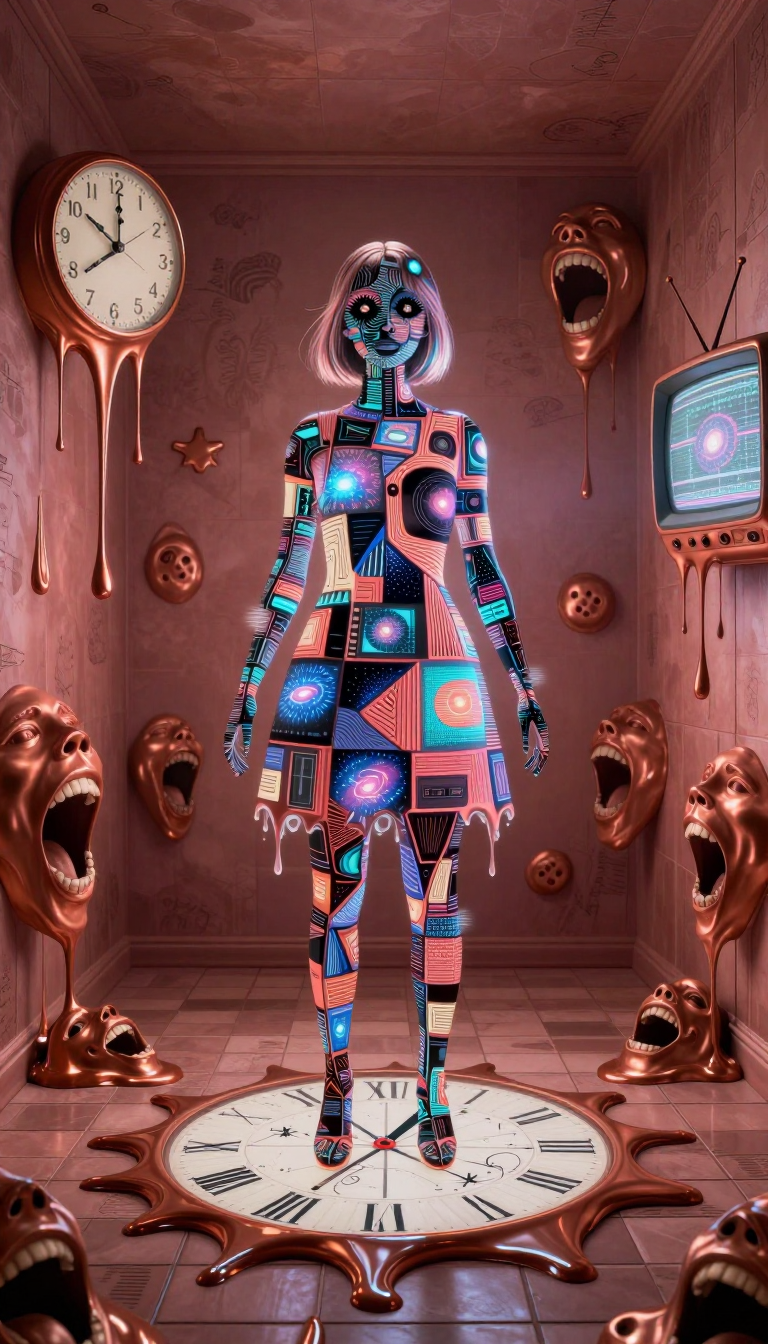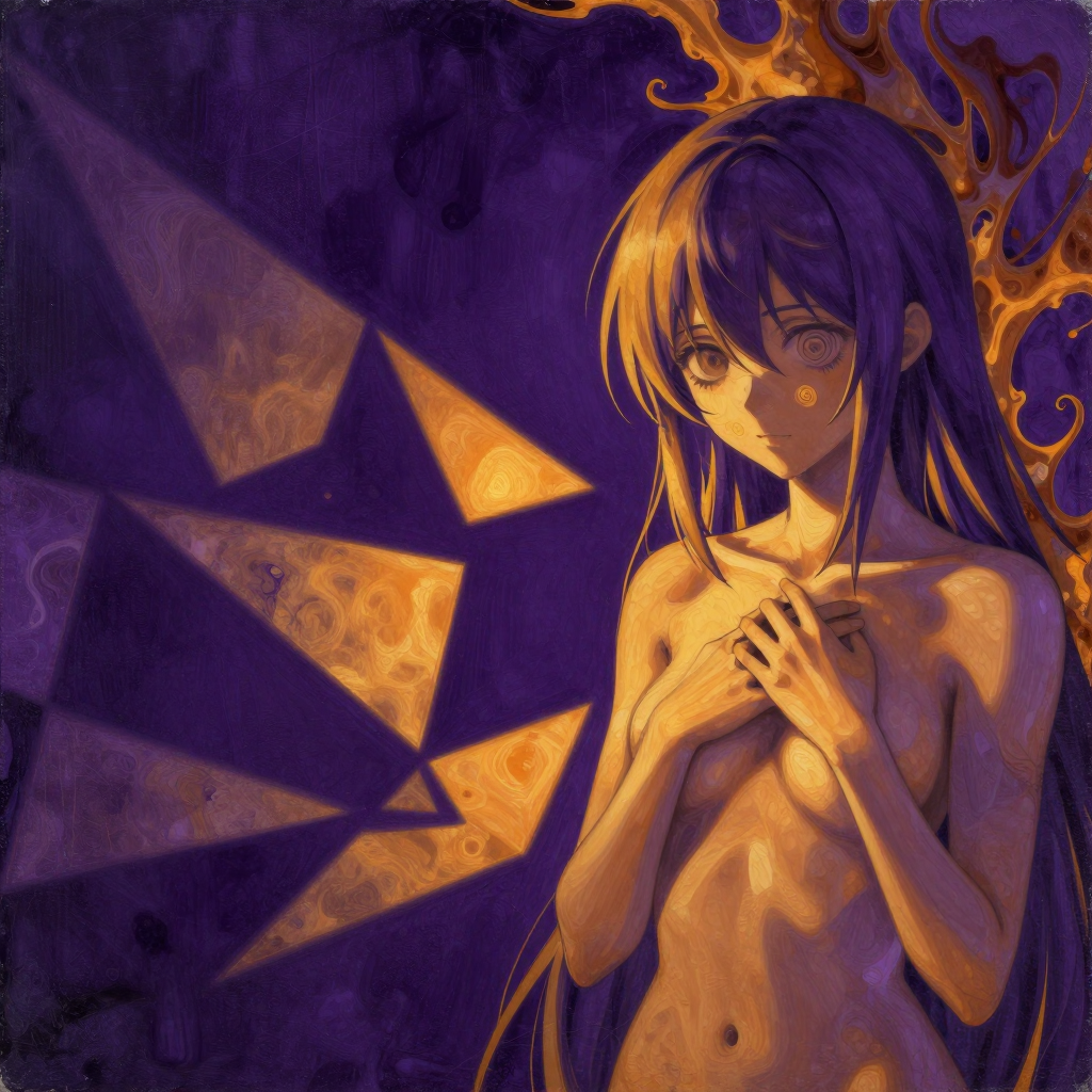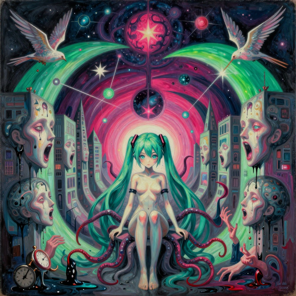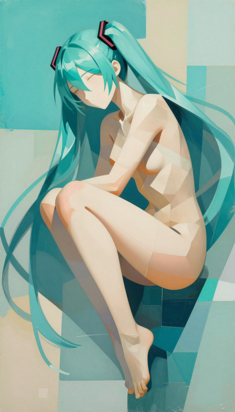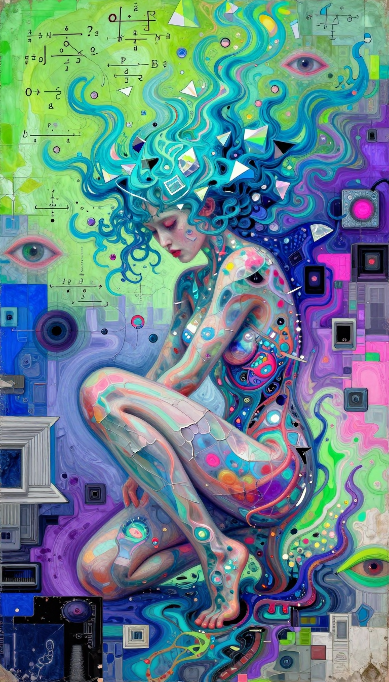 >>107814489the subject's aqua hair dissolves into cascading mathematical equations that spiral into void, each strand a separate dimension bleeding into consciousness fractured geometry her body exists simultaneously in multiple states\: nude form fragmenting into crystalline shards of light that refract through impossible angles, flesh becoming translucent membrane where organs pulse as bioluminescent nebulae knees pulled to torso create negative space that warps perspective, limbs melting into abstract expressionist strokes of cobalt blue and electric cyan that scream against the canvas censoring appears as geometric blocks that themselves become art they're not covering but revealing, each black shape containing entire universes of texture and depth add layers upon layers of glitch effects, datamoshing, digital decay, as if the image is being transmitted across dimensions with static interference include surreal elements\: floating eyes, fragmented text in dead languages, architectural impossibilities, organic forms that are simultaneously human and machine use extreme color theory contrasts acid greens against bruised purples, fluorescent pinks clashing with industrial grays make everything feel unstable, dreamlike, on the verge of collapsing into chaos while maintaining an underlying structure that suggests hidden meaning surface should appear cracked like old paint, weathered, ancient yet futuristic create movement through static everything vibrating at molecular level, particles barely holding together