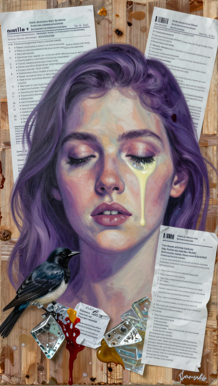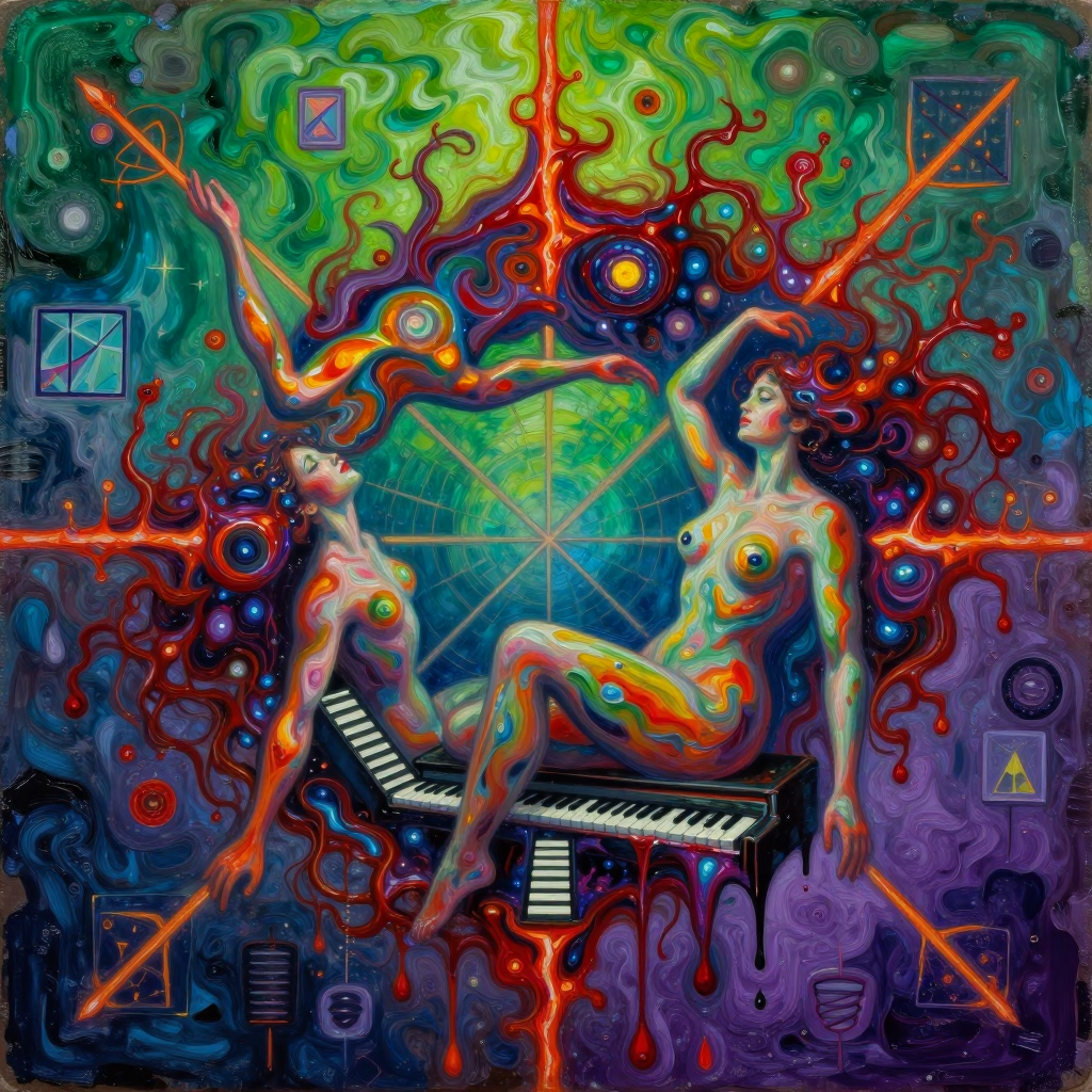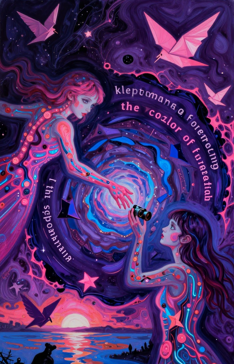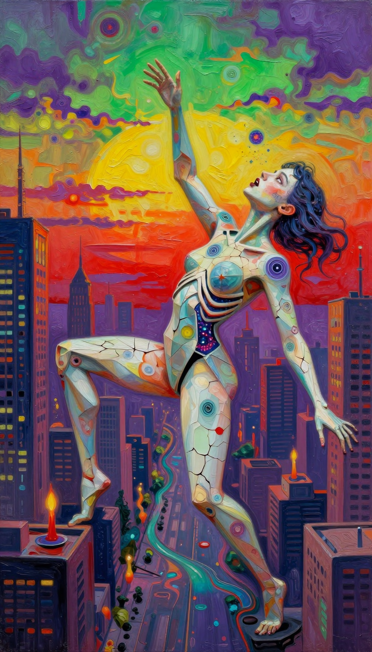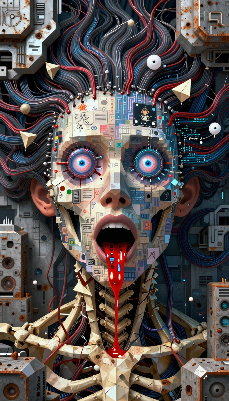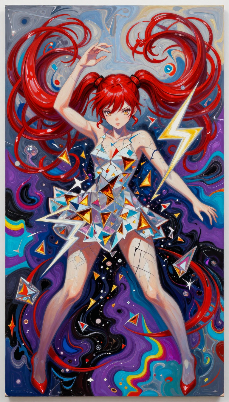 >>107814489the subject's aqua hair dissolves into cascading mathematical equations that spiral into void, each strand a separate dimension bleeding into consciousness fractured geometry her body exists simultaneously in multiple states\: nude form fragmenting into crystalline shards of light that refract through impossible angles, flesh becoming translucent membrane where organs pulse as bioluminescent nebulae knees pulled to torso create negative space that warps perspective, limbs melting into abstract expressionist strokes of cobalt blue and electric cyan that scream against the canvas censoring appears as geometric blocks that themselves become art they're not covering but revealing, each black shape containing entire universes of texture and depth add layers upon layers of glitch effects, datamoshing, digital decay, as if the image is being transmitted across dimensions with static interference include surreal elements\: floating eyes, fragmented text in dead languages, architectural impossibilities, organic forms that are simultaneously human and machine use extreme color theory contrasts acid greens against bruised purples, fluorescent pinks clashing with industrial grays make everything feel unstable, dreamlike, on the verge of collapsing into chaos while maintaining an underlying structure that suggests hidden meaning surface should appear cracked like old paint, weathered, ancient yet futuristic create movement through static everything vibrating at molecular level, particles barely holding together