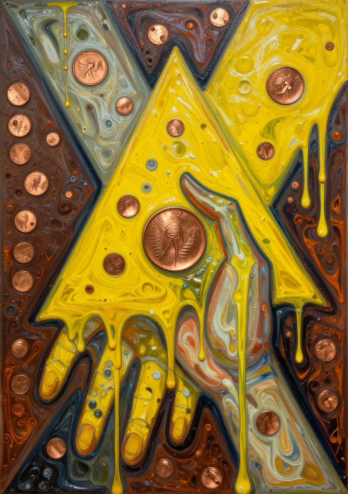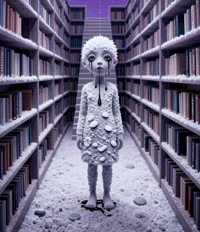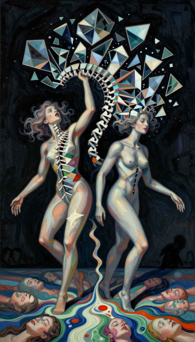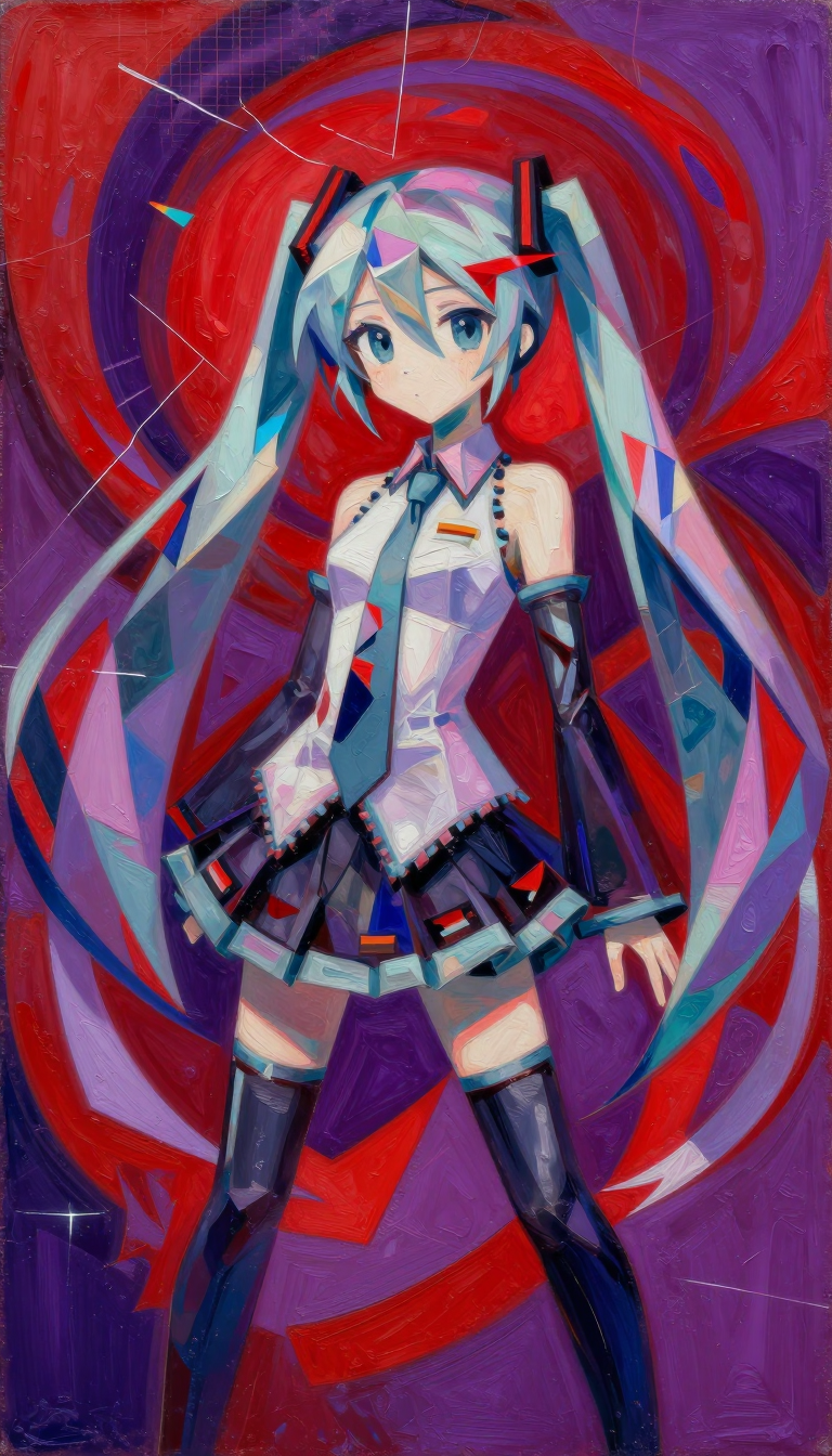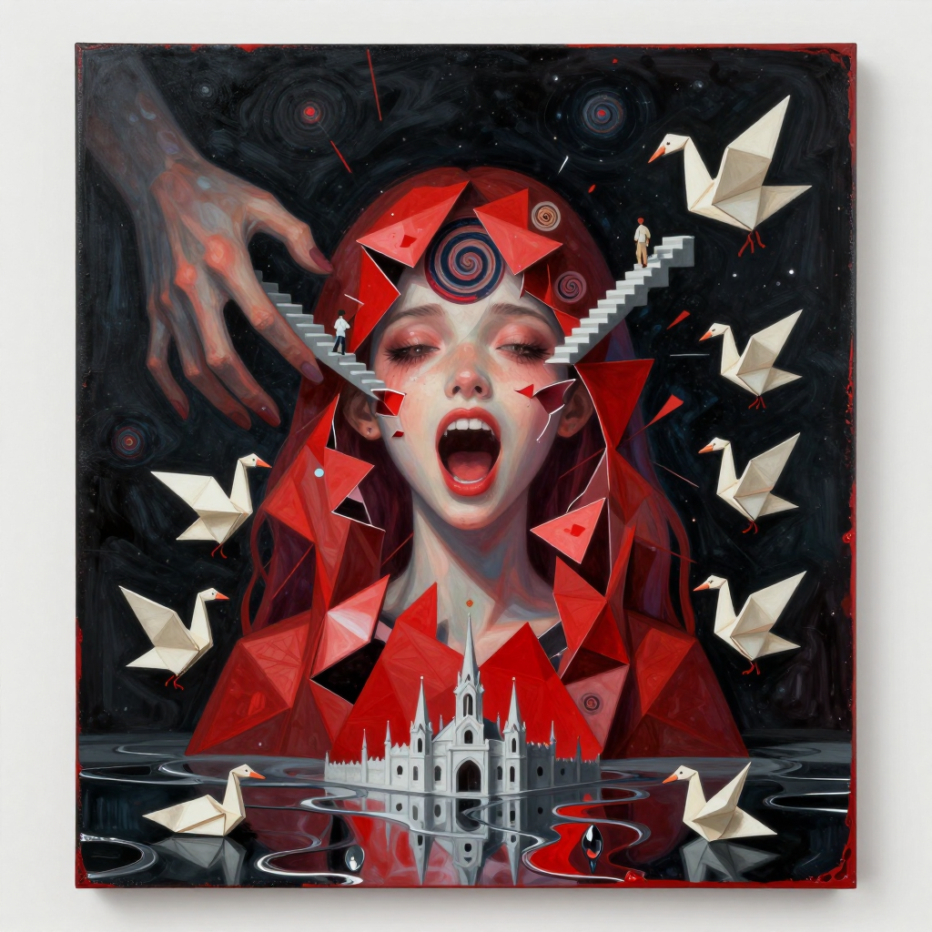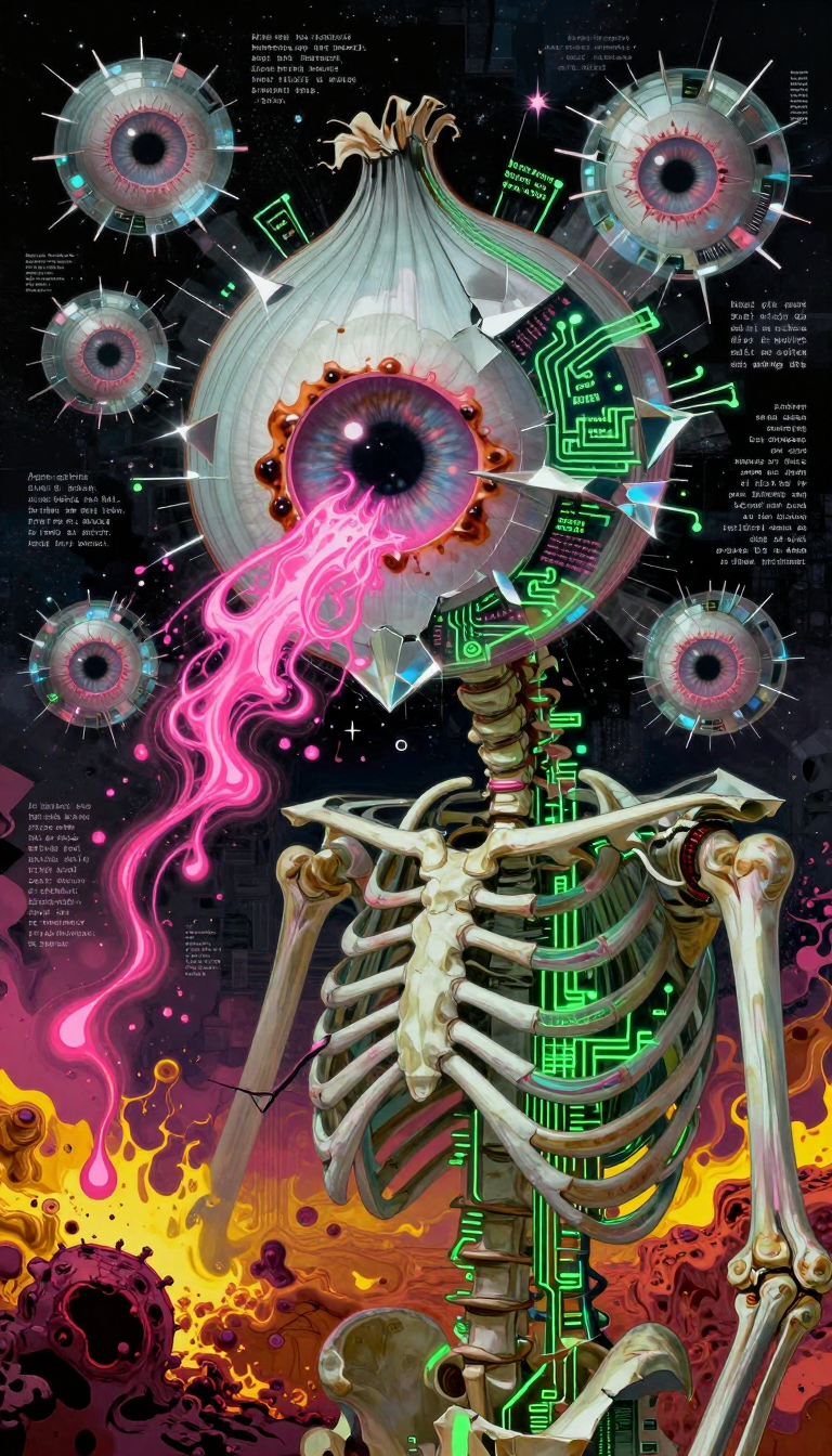 >>107814489the subject's aqua hair dissolves into cascading mathematical equations that spiral into void, each strand a separate dimension bleeding into consciousness fractured geometry her body exists simultaneously in multiple states\: nude form fragmenting into crystalline shards of light that refract through impossible angles, flesh becoming translucent membrane where organs pulse as bioluminescent nebulae knees pulled to torso create negative space that warps perspective, limbs melting into abstract expressionist strokes of cobalt blue and electric cyan that scream against the canvas censoring appears as geometric blocks that themselves become art they're not covering but revealing, each black shape containing entire universes of texture and depth add layers upon layers of glitch effects, datamoshing, digital decay, as if the image is being transmitted across dimensions with static interference include surreal elements\: floating eyes, fragmented text in dead languages, architectural impossibilities, organic forms that are simultaneously human and machine use extreme color theory contrasts acid greens against bruised purples, fluorescent pinks clashing with industrial grays make everything feel unstable, dreamlike, on the verge of collapsing into chaos while maintaining an underlying structure that suggests hidden meaning surface should appear cracked like old paint, weathered, ancient yet futuristic create movement through static everything vibrating at molecular level, particles barely holding together