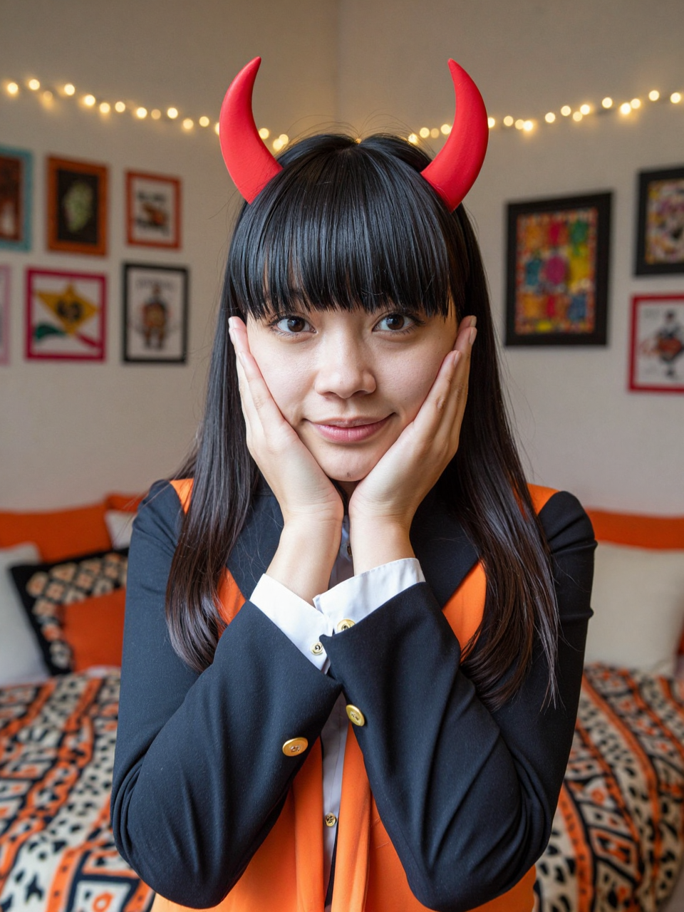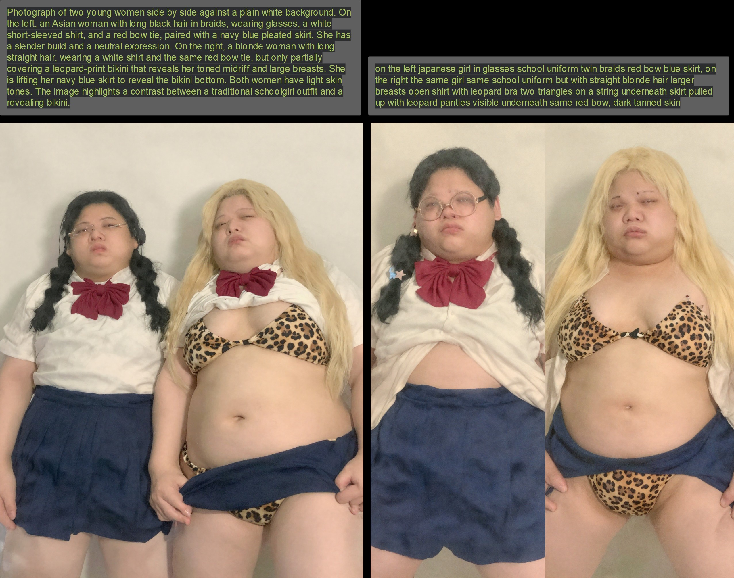 >>107815383prolly zit and prompt is prolly >Photograph of two young women side by side against a plain white background. On the left, an Asian woman with long black hair in braids, wearing glasses, a white short-sleeved shirt, and a red bow tie, paired with a navy blue pleated skirt. She has a slender build and a neutral expression. On the right, a blonde woman with long straight hair, wearing a white shirt and the same red bow tie, but only partially covering a leopard-print bikini that reveals her toned midriff and large breasts. She is lifting her navy blue skirt to reveal the bikini bottom. Both women have light skin tones. The image highlights a contrast between a traditional schoolgirl outfit and a revealing bikini.