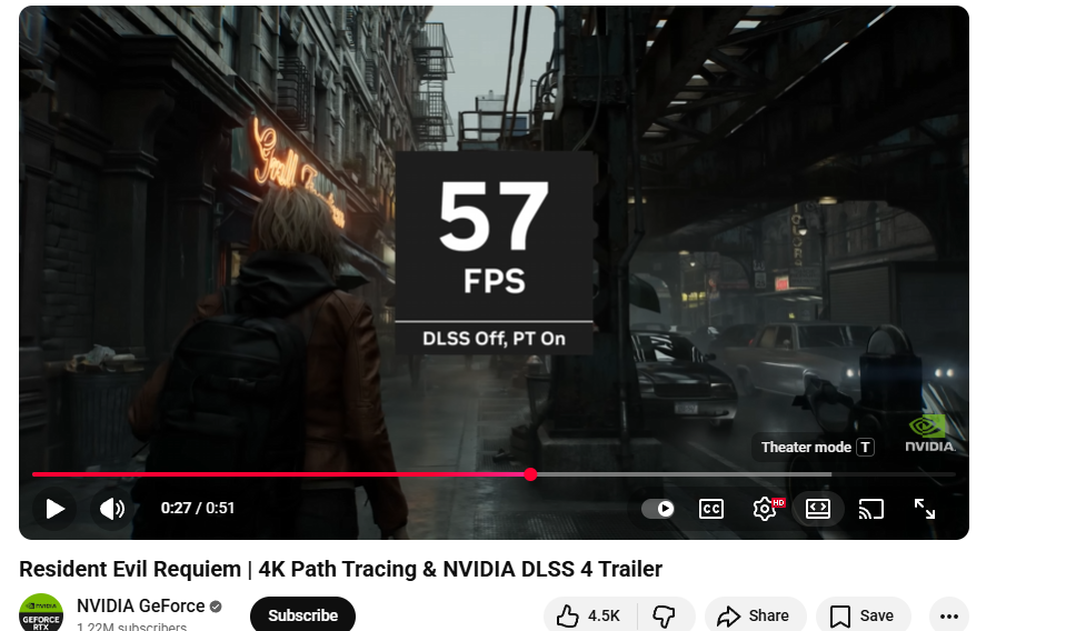 >>107827307Nvidia claimed a 5090 (im guessing is the card) can run pathtraced resident evil requiem at 57 fps at 4k without DLSS, if this is true then expect this number to get even more retarded specially if dlss 4.5 is forcing ampere/turing users into upgrading