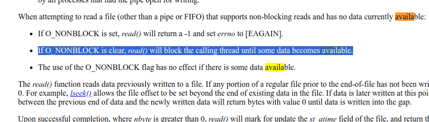 why file descriptors are blocking by default?say i have a pipe fd that poll (or select (or epoll)) lets me know that this pipe is readablehow am i supposed to know that I read everything off the pipe without making that file descriptor non-blocking?also most tutorials dont even tell you can just make fds nonblockig, took me a while to realize that