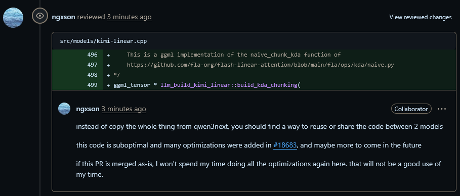 >>107833201It means that he doesn't know the history ngxson has with AI PRs and that ngxson tired of that shit.There were two kimi-linear PRs, the contributors using the PR as a blog, then they merged into one and they've been at it for long enough to suspect neither of them knows what they're doing.