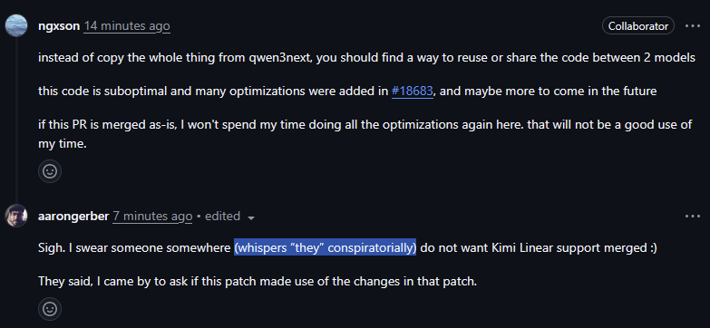 now let's get back on topic. the kimi-linear pr was rebasedKimi-Linear support (backend agnostic + MLA KV cache) #18755https://github.com/ggml-org/llama.cpp/pull/18755