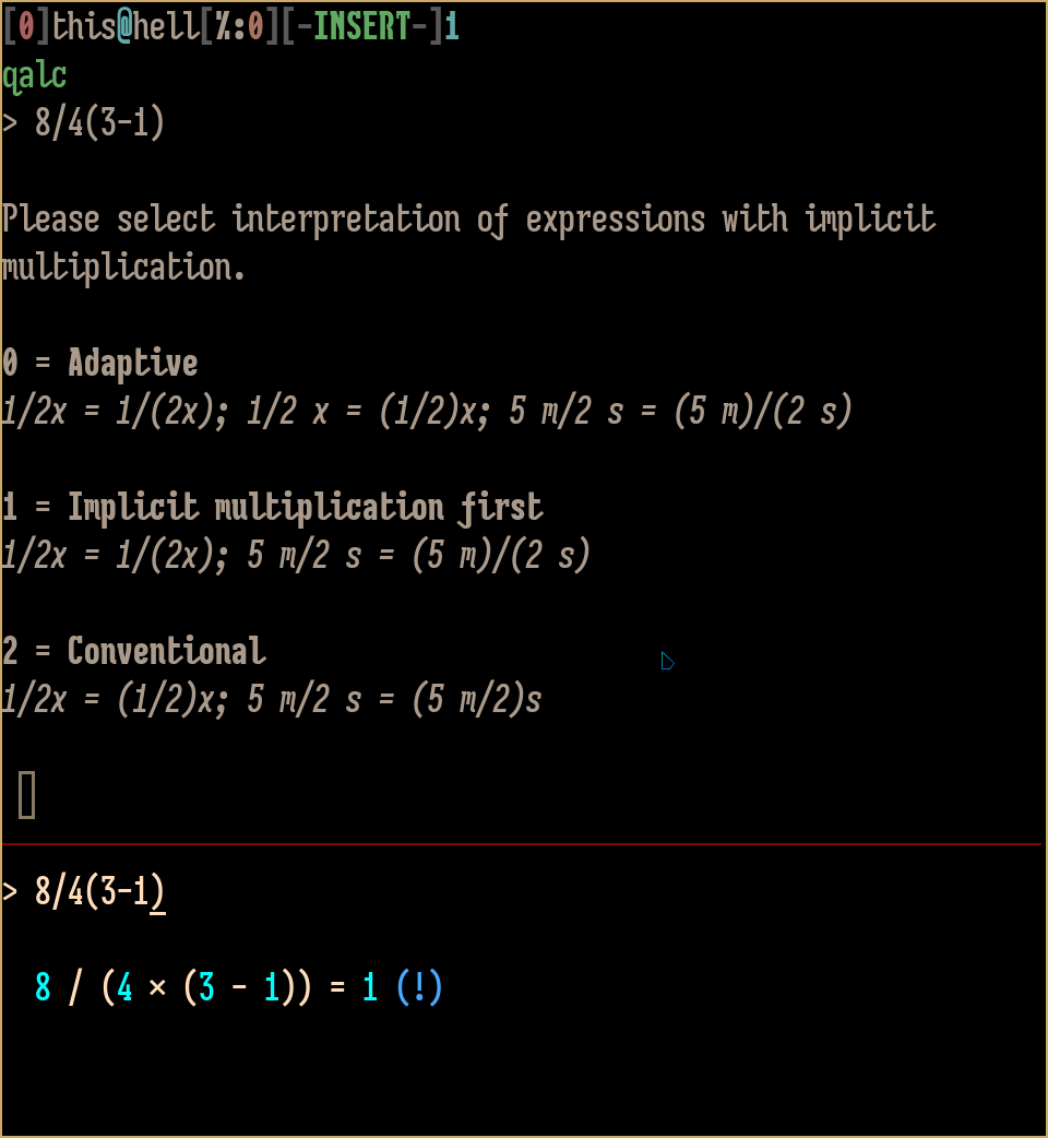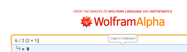 >>107832359991CW gives 1, and, insanely, adds an extra set of parentheses I didn't put in there, so>6/2(2+1)actually becomes>6/(2(2+1))when I hit EXEShit like this is why I fucking hate math.